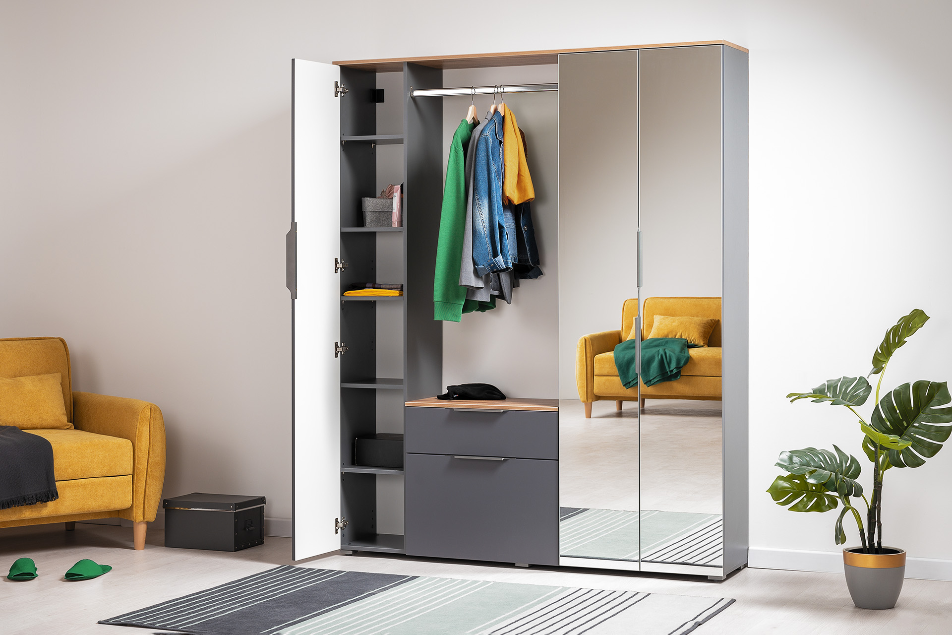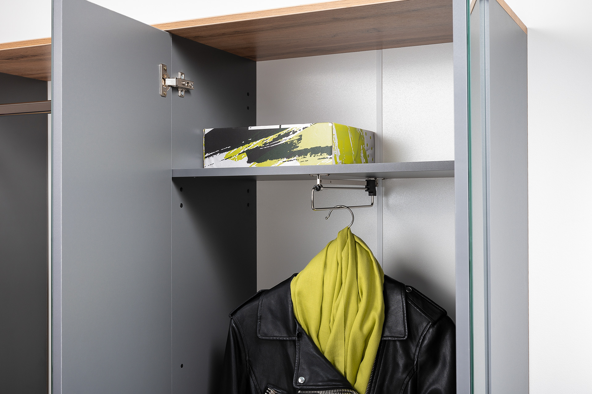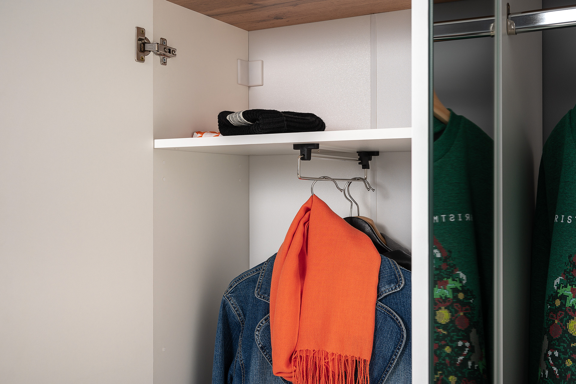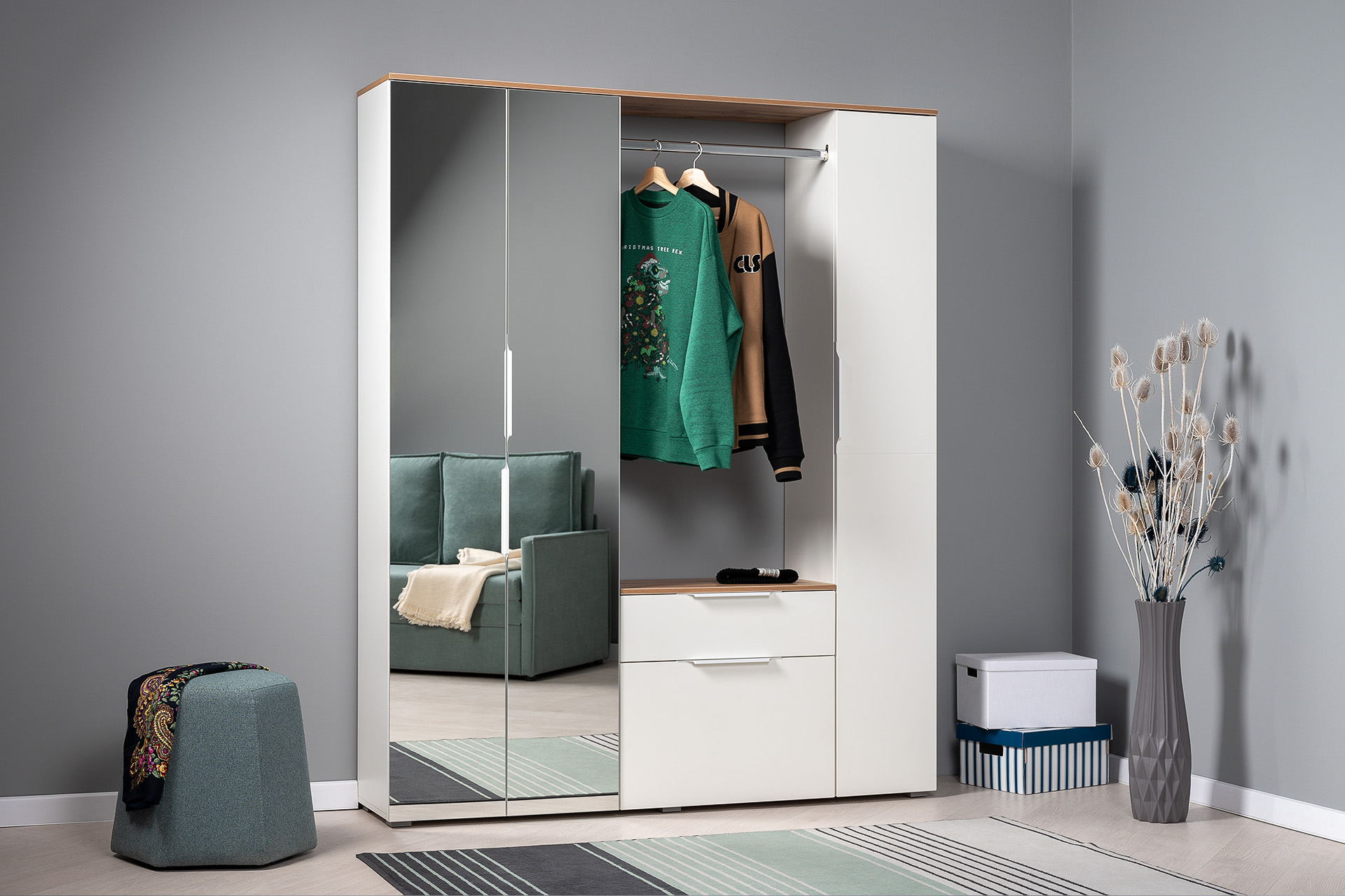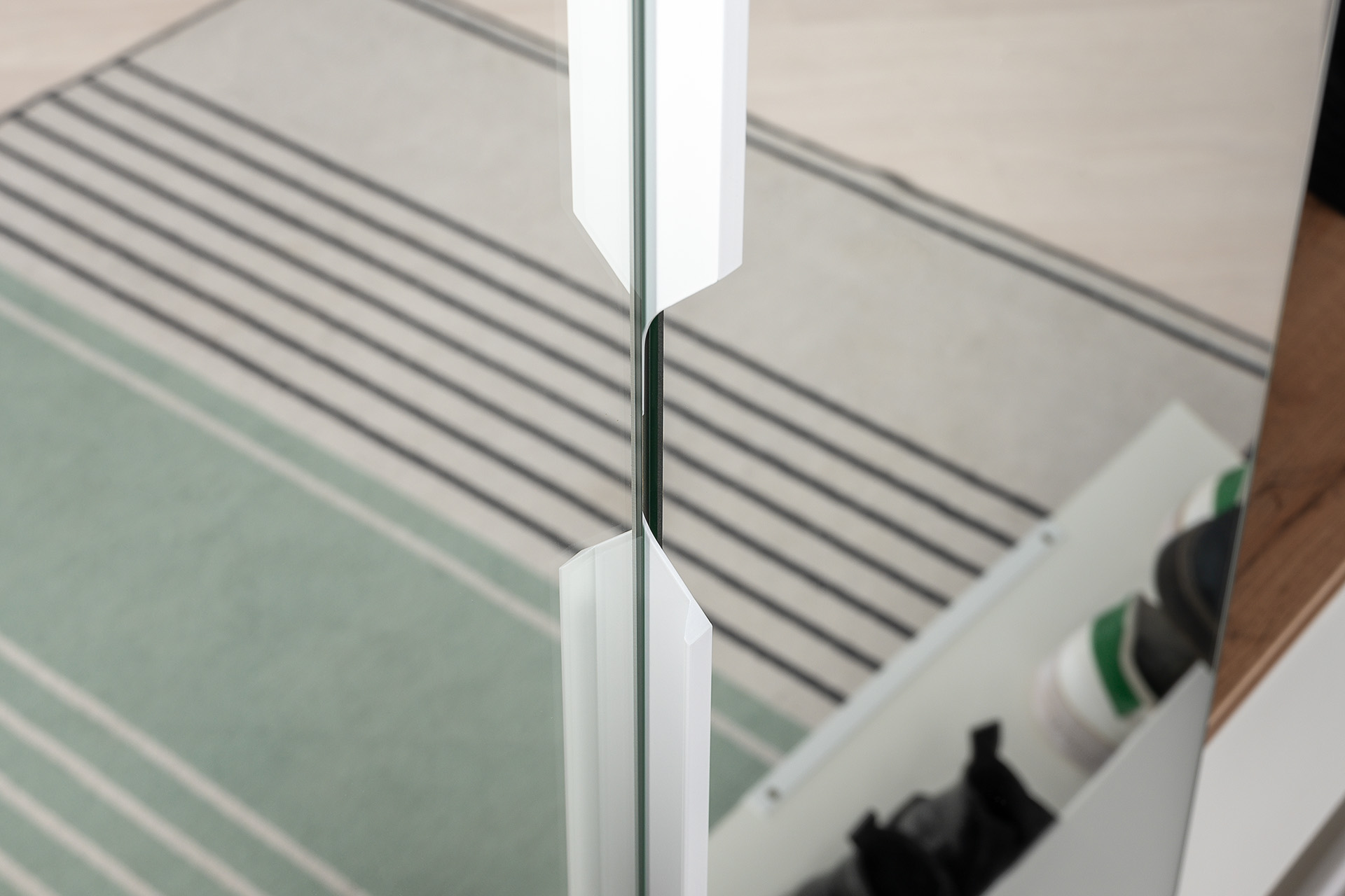 Зеркальные створки шкафа визуально расширяют пространство, а минималистичные алюминиевые ручки подчеркивают легкость и простоту линий. -