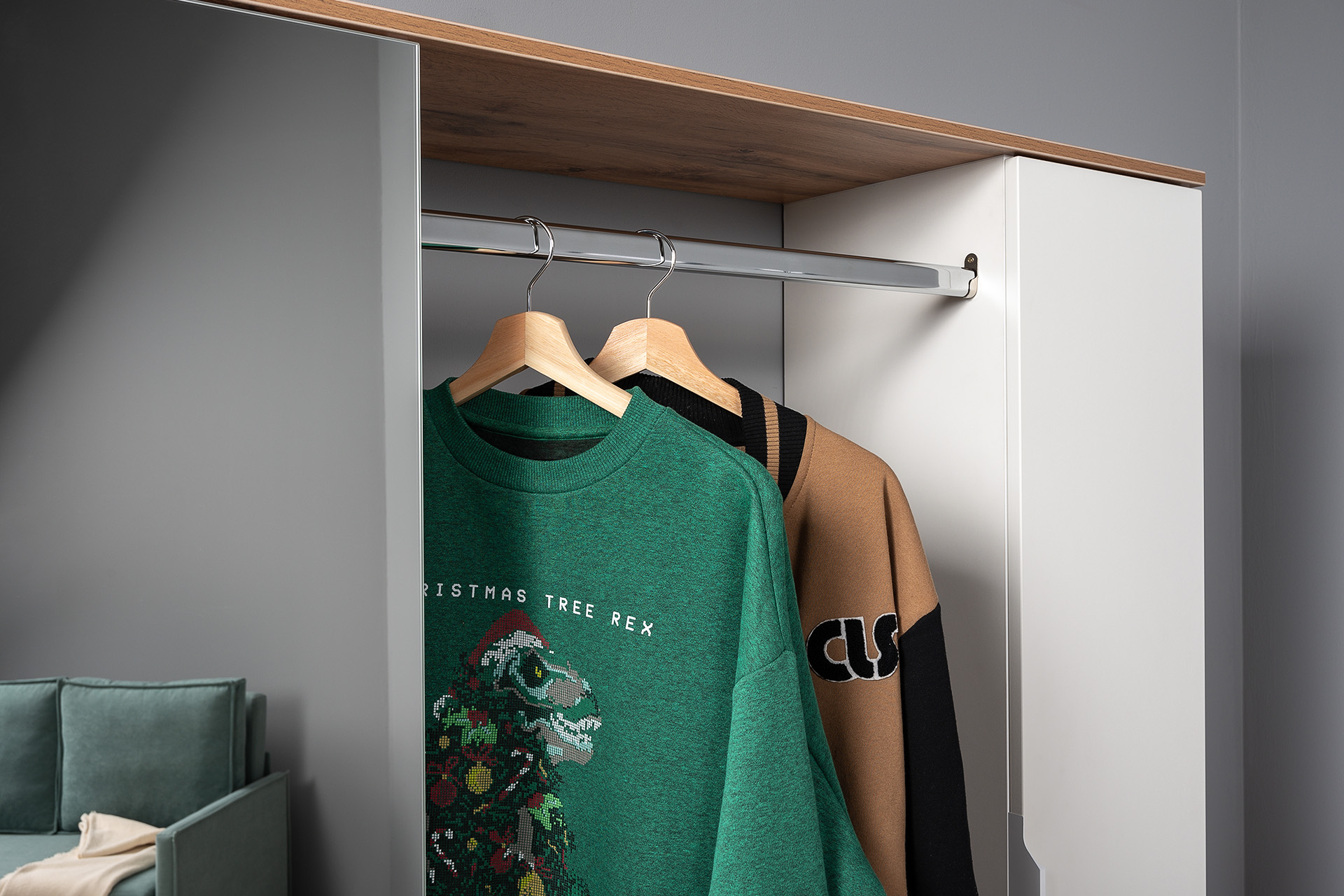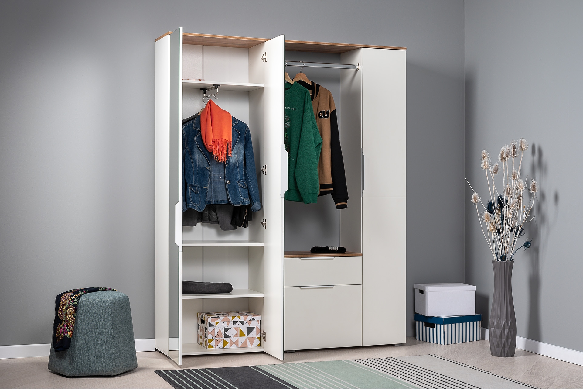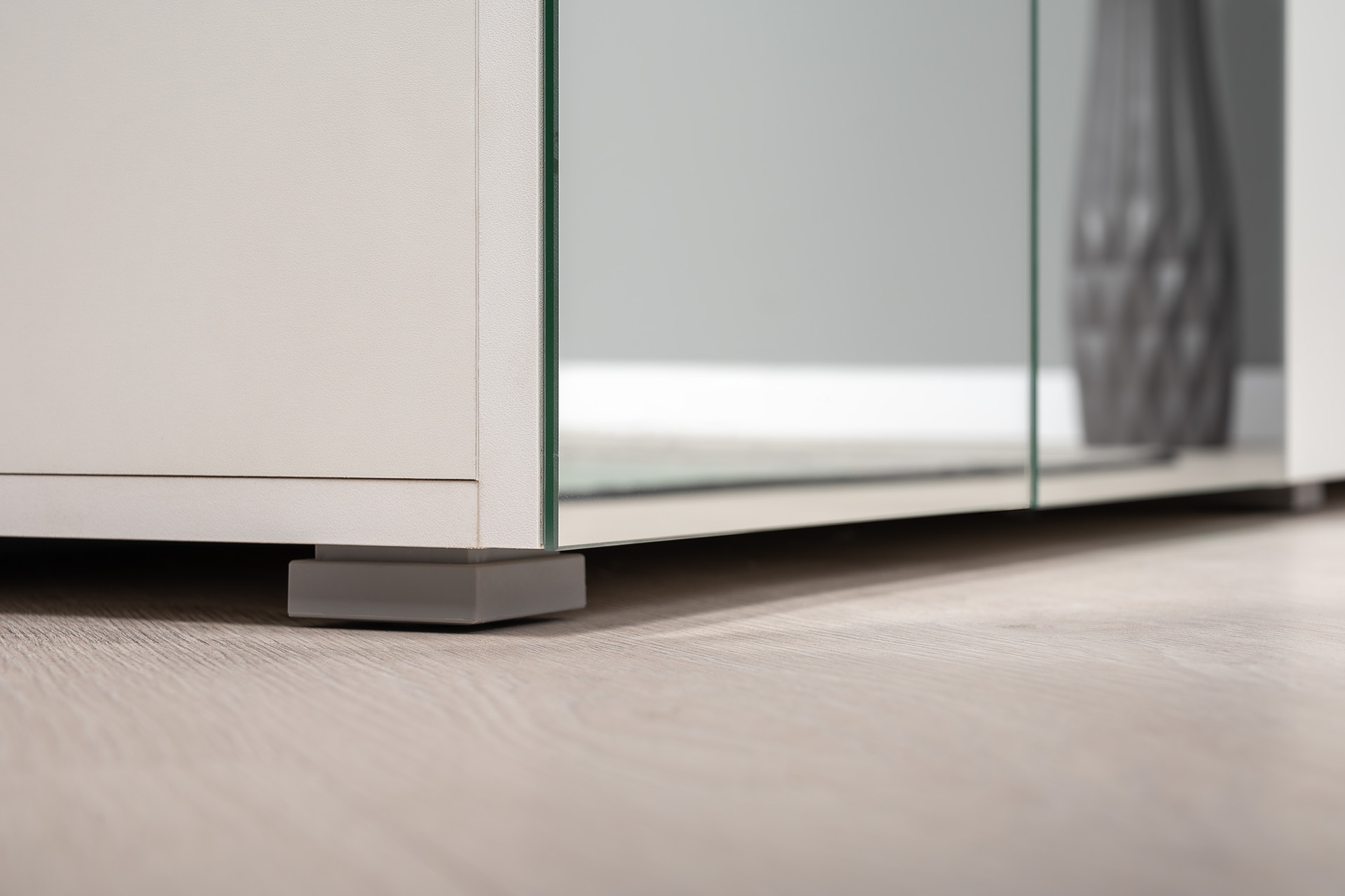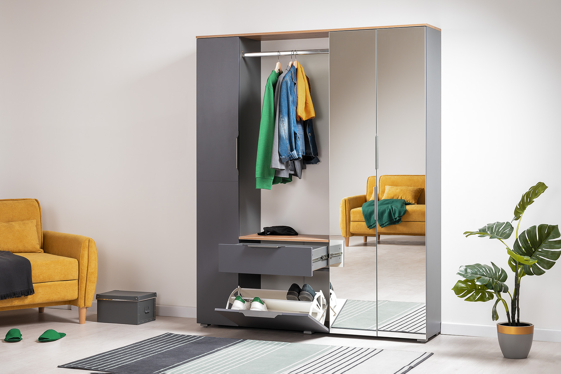 Зеркальные створки шкафа визуально расширяют пространство, а минималистичные алюминиевые ручки подчеркивают легкость и простоту линий. -