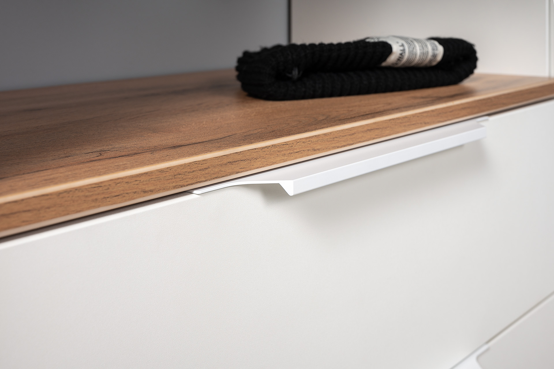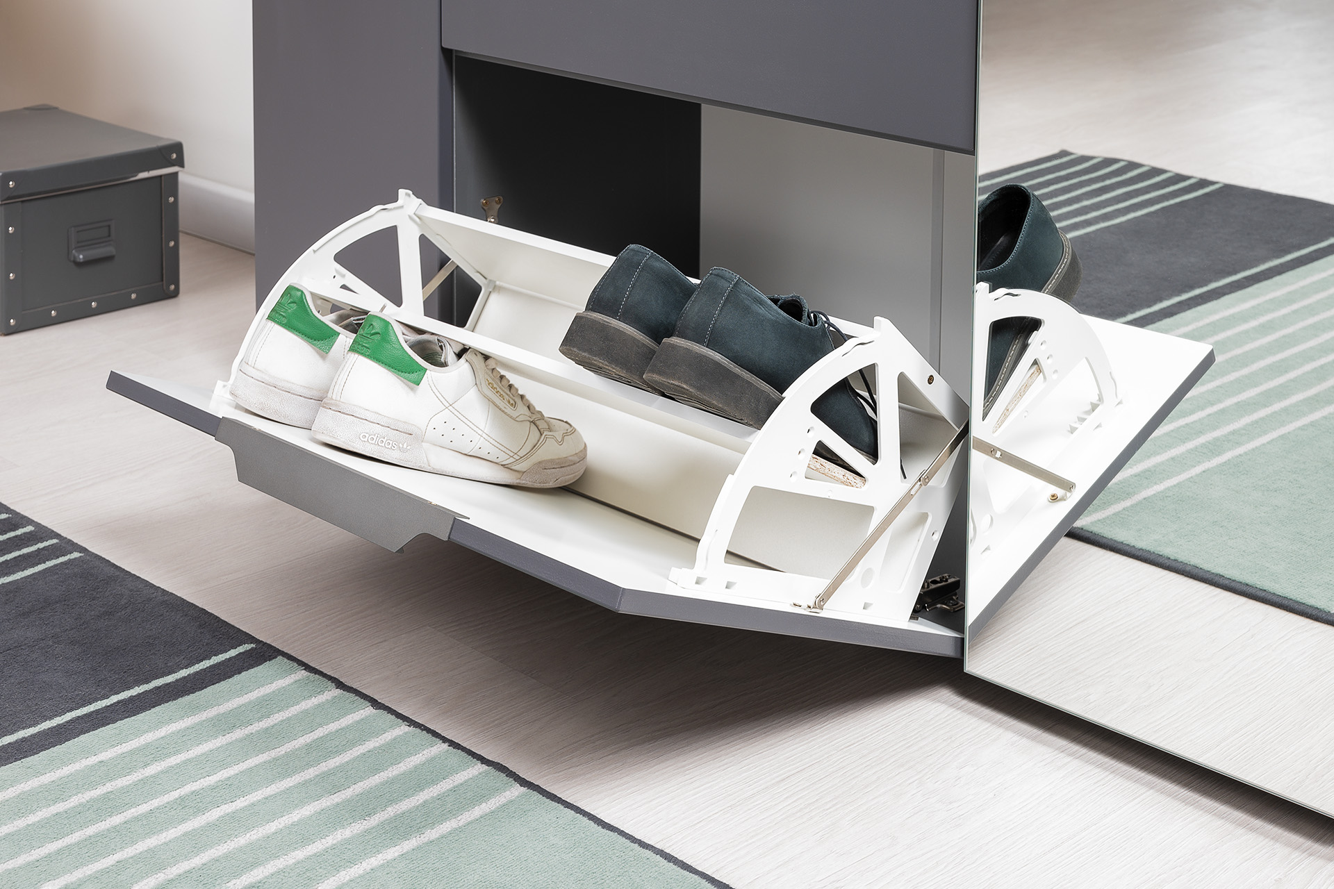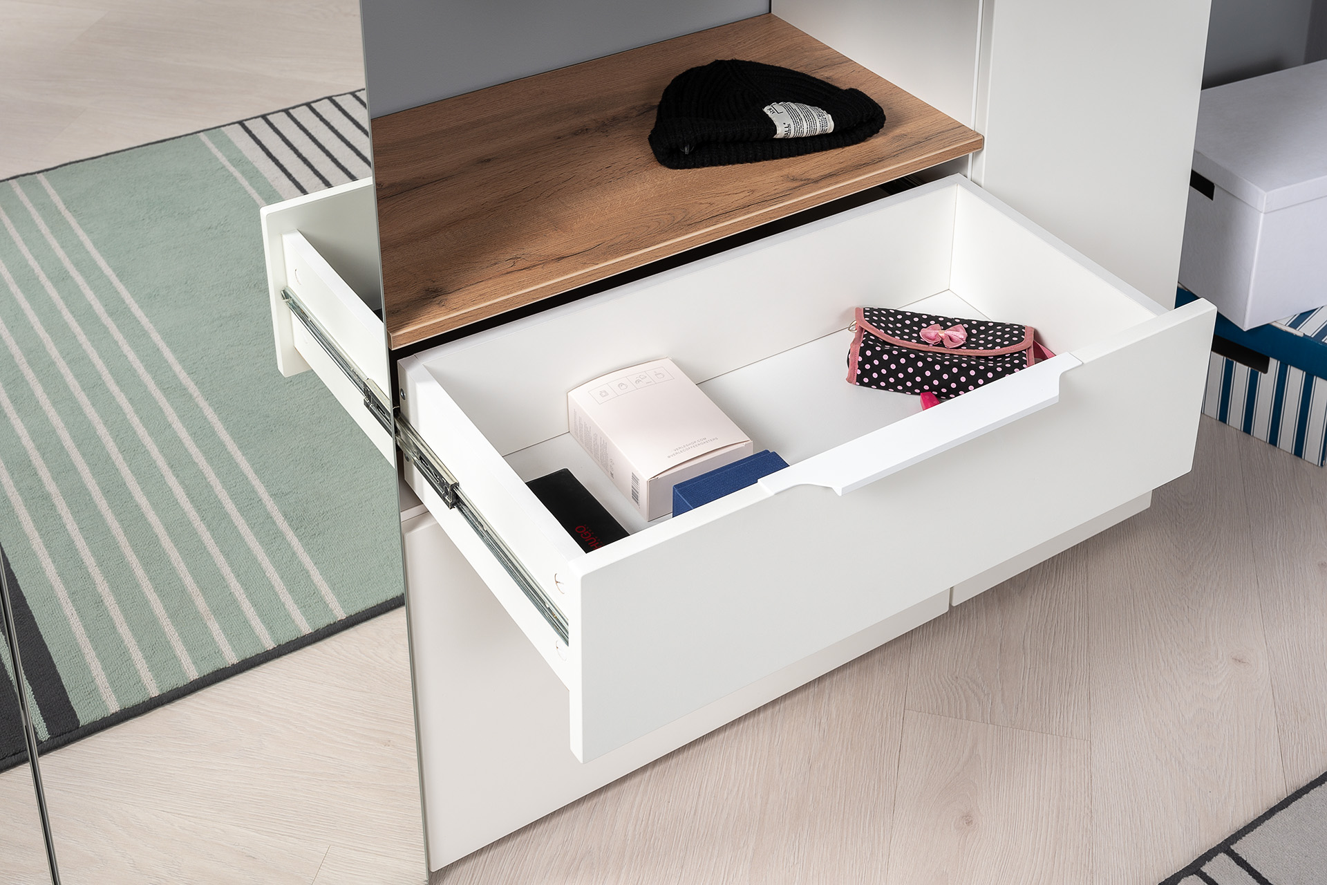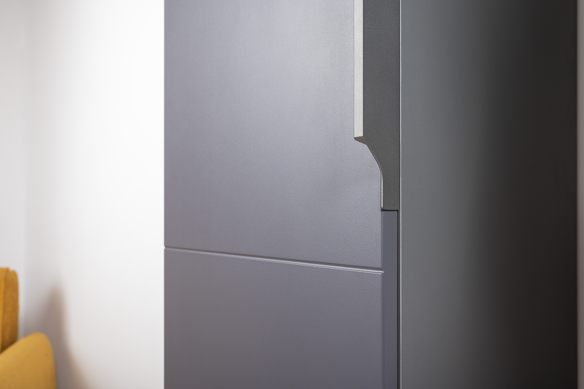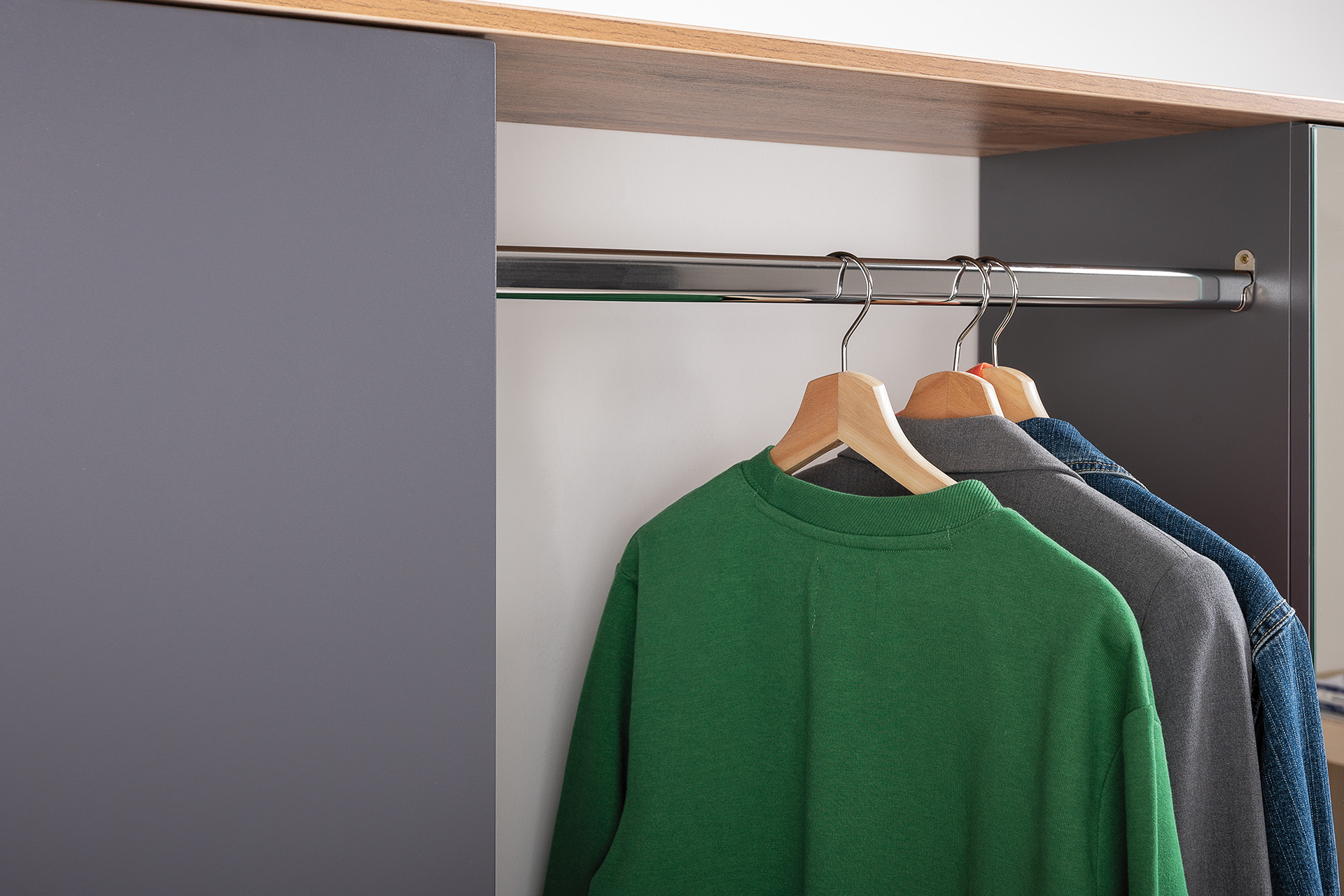 Зеркальные створки шкафа визуально расширяют пространство, а минималистичные алюминиевые ручки подчеркивают легкость и простоту линий. -