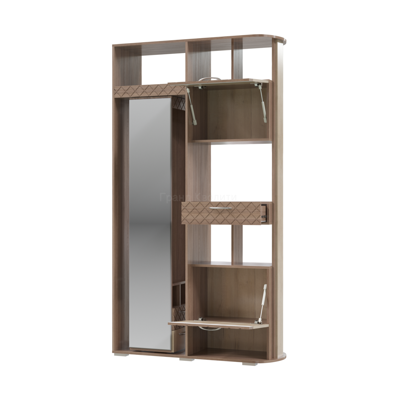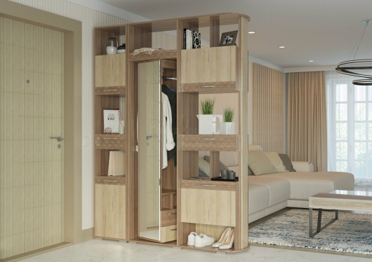 - прихожая-перегородка пенал Верта 2-3508 - Ш410 х Г450 х В2200 мм.Прихожая-перегородка Верта станет настоящей находкой для зонирования открытого помещения или компактной квартиры-студио. Изделие отделит коридор, а также предоставит место для размещения верхней одежды, головных уборов, обуви и различных аксессуаров. Прихожая оборудована поворотным механизмом с зеркалом, выдвижными ящиками, открытыми полками и специальными секциями для хранения вещей.