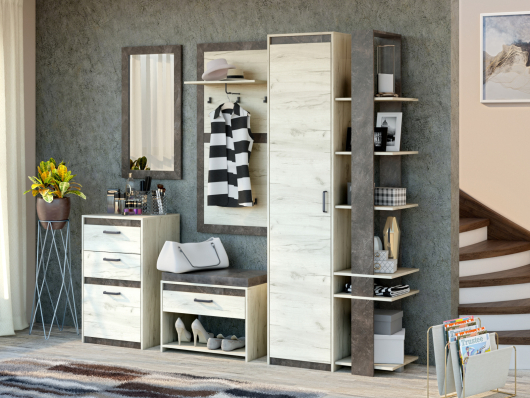 - стеллаж Прага - Ш400 x Г440 х В2150 мм.Прихожая Прага (вариант 2) поможет обустроить достаточно функциональное и теплое помещение, которое с порога будет приветствовать вас. Крючки на вешалке и штанга для вешалок-плечиков в пенале предназначены для размещения верхней одежды. За нижними дверками тумб можно разместить обувь всей семьи или использовать пространство для хранения косметики по уходу за обувью, различных аксессуаров и других мелких предметов. Поверхность низкой тумбы пригодится в качестве сиденья для комфортного надевания или снятия обуви. Мебель Прага актуальна и универсальна благодаря прямым и строгим линиям, трендовому дизайну модулей.