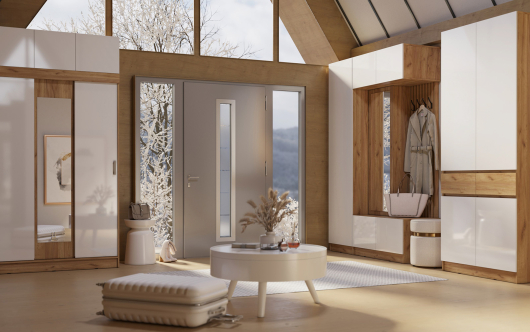 Прихожая Роджина просто находка для ценителей современного стиля. Корпус выполнен в древесном цвете, что придаст вашей прихожей уют. Фасады выполнены могут быть в белом глянцевом цвете или сером графите. Наполнение мебели Роджина очень продумано. Вместо ручек предусмотрены утопленные вглубь планки, которые создают нишу за фасадом для захвата и открывания рукой. -
