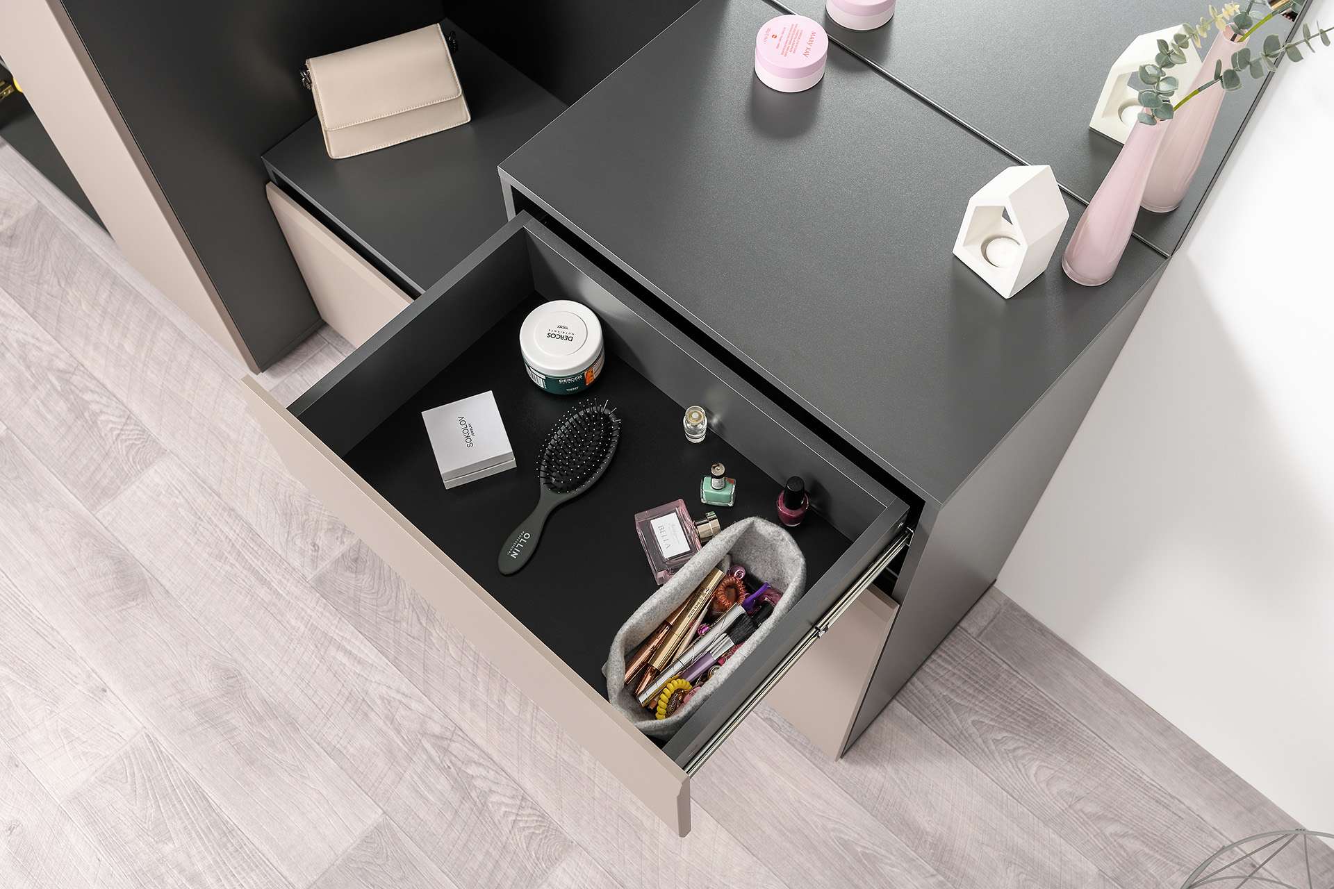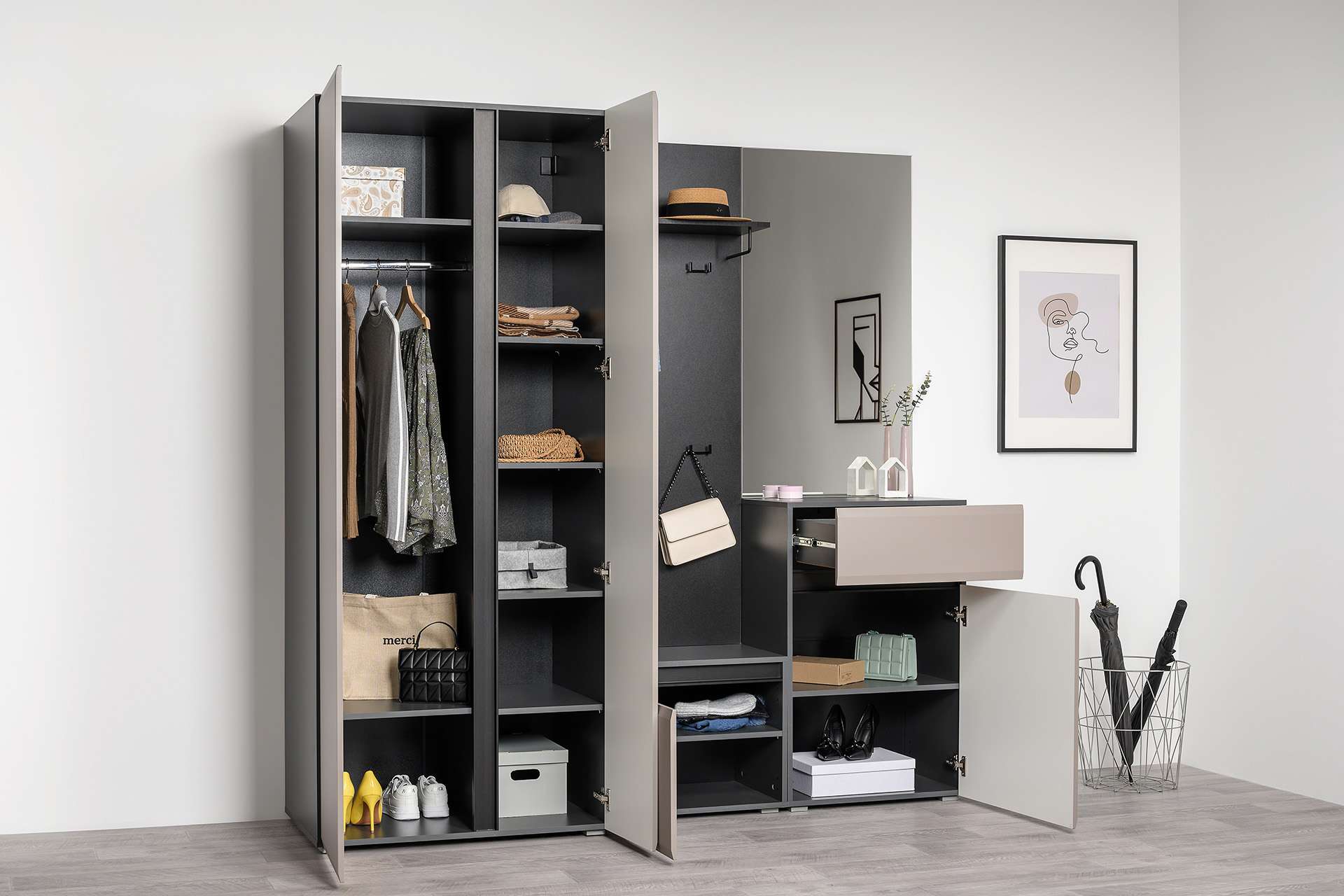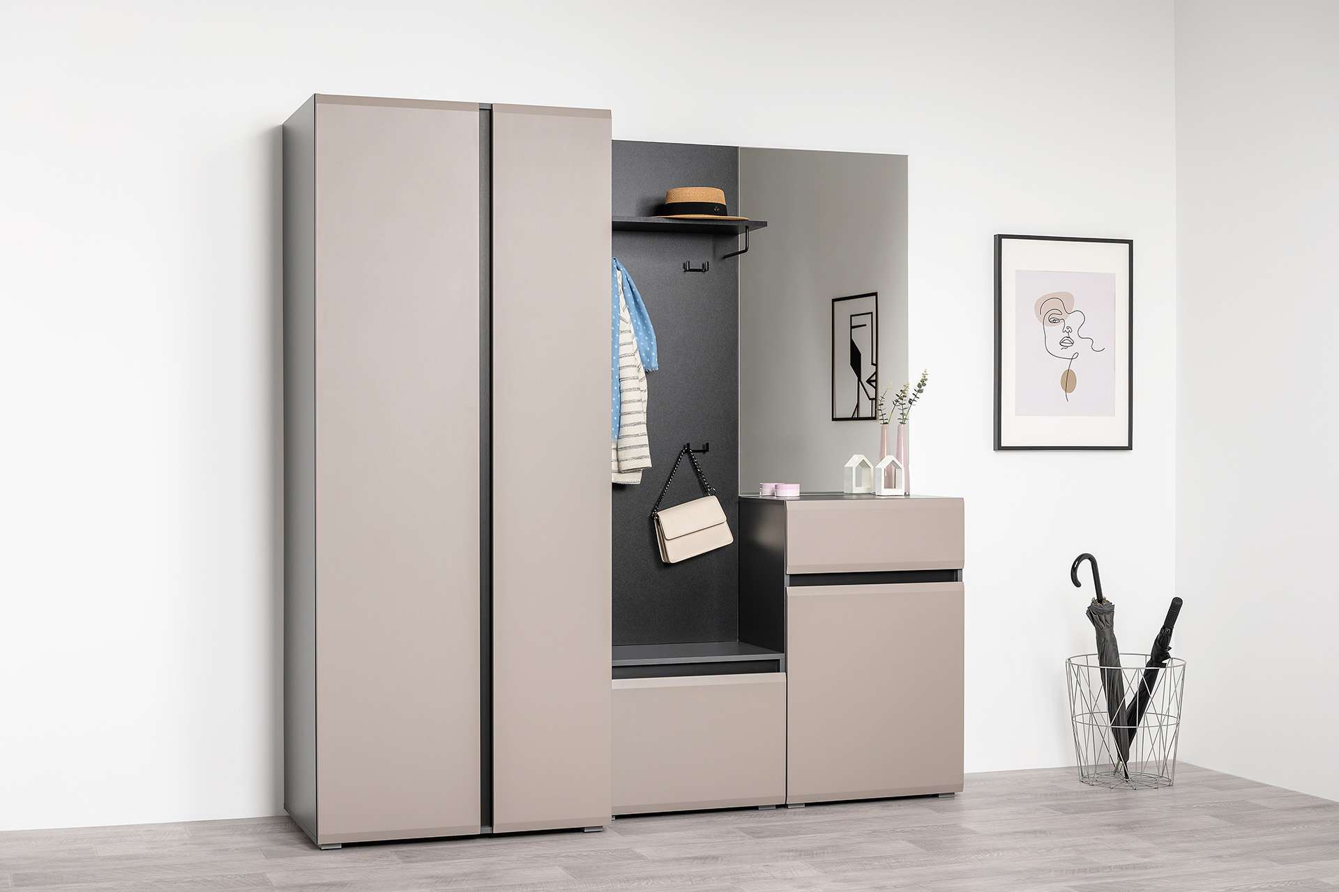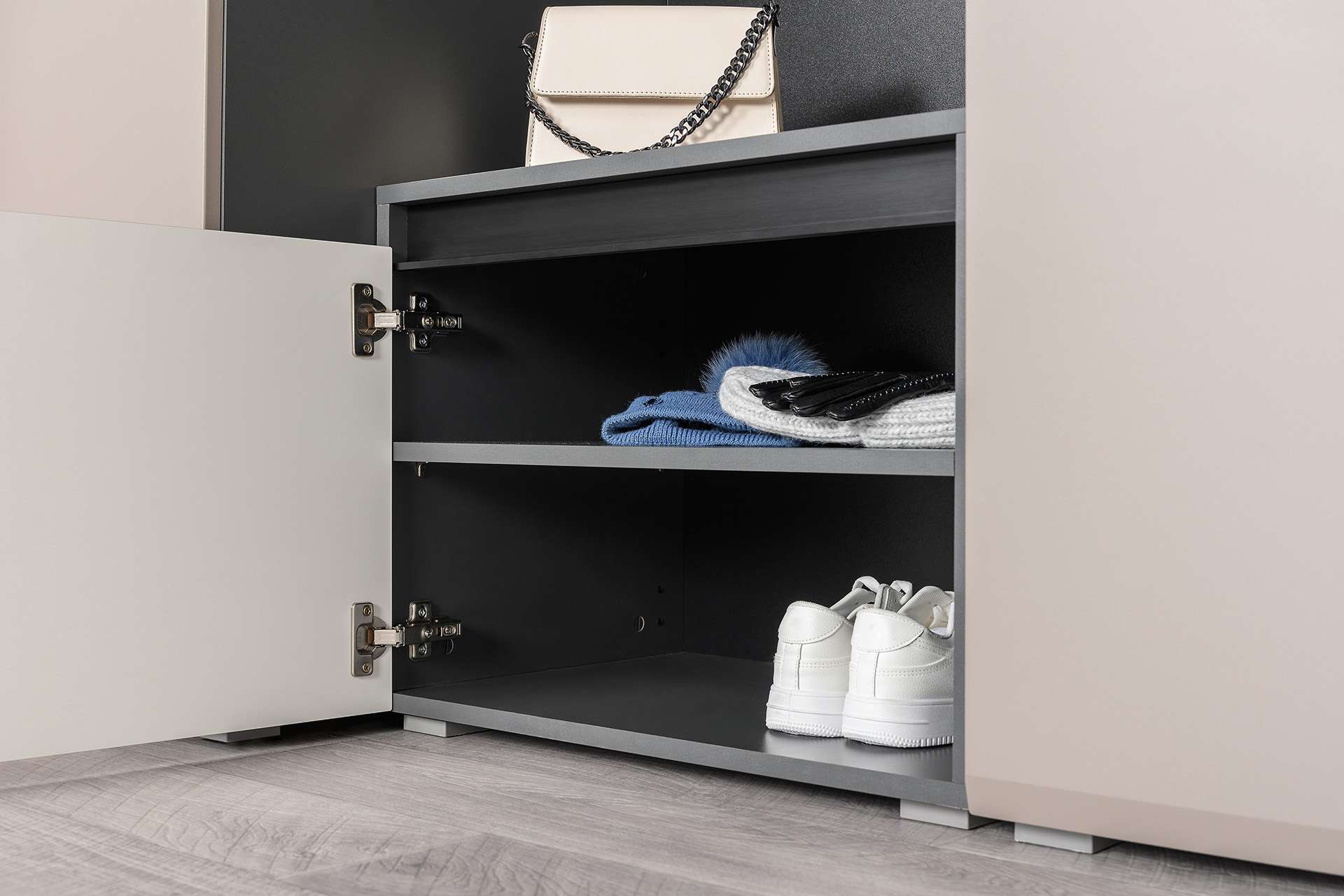 Прихожая Сидней стильная и функциональная, которая масштабируется под любую площадь помещения и высоту потолков. Минималистичные фасады в трендовом цвете без лицевой фурнитуры открываются за край либо нажатием (push-to-open). Вместительная система для хранения одежды, обуви и хозяйственных принадлежностей. -