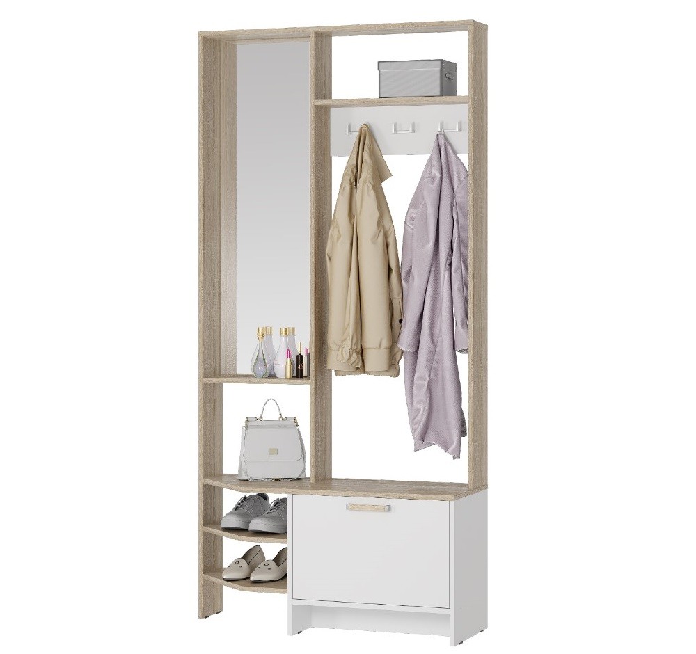 Прихожая Тео ПР-01 отличный вариант для небольшого коридора. Идеальный вариант для малогабариток и квартир-студий в современном стиле. Большое зеркало, открытая верхняя полка для головных уборов и сезонных аксессуаров, крючки для верхней одежды, а также закрытая тумба-обувница и комплект полок для домашней обуви – все, что нужно для Вашего комфорта в прихожей. -