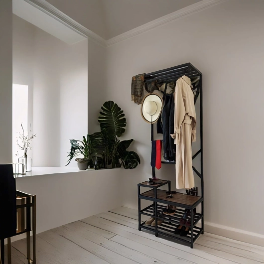 Вместительная обувница для прихожей рассчитана максимально на 10 пар обуви. Компактная конструкция вместится во встроенный шкаф. Полка для обуви при необходимости может использоваться для размещения коробок. Благодаря 5 прочным крючкам, расположенным на разной высоте, напольная вешалка для одежды будет удобна детям и взрослым. Также обращаем Ваше внимание, что у данной модели есть планка для вешалок на верхней полочке. Если у вас небольшая прихожая, такая аккуратная напольная вешалка прекрасно впишется в современный дизайн. Полка для обуви в прихожую открытой модели выглядит максимально облегченно, не загромождает пространство.
