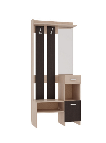 Прихожая Яр поможет обустроить уютную прихожую, которая будет приветливо встречать вас прямо с порога. Два крючка на вешалке предназначены для размещения верхней одежды. Антресольная полка создана для головных уборов и шарфов. Нижнее открытое отделение с полкой пригодится для аккуратного размещения обуви. Небольшое зеркало перед выходом из дома позволит убедится в том, что выглядите вы неотразимо. Полки, скрытые за распашной дверкой, и небольшой выдвижной ящик пригодятся для сложенной одежды и различных аксессуаров.