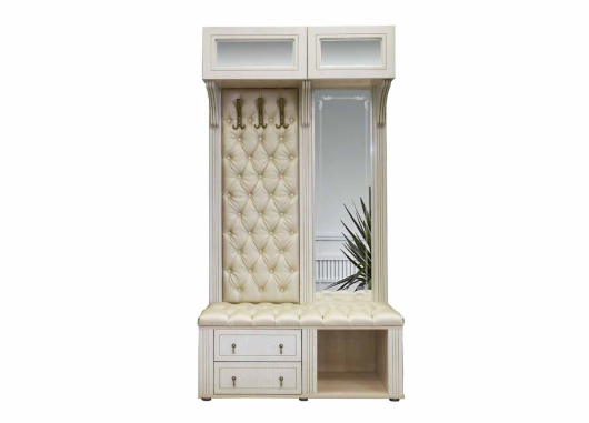 Белый корпус из ЛДСП и фасад, украшенный вертикальной фрезеровкой, зрительно изменяют габариты конструкции, как бы вытягивая ее. Зеркала, отражая свет и окружающие предметы, позволяют стенке как бы раствориться в пространстве, слиться с ним воедино. На виду остаются только бронзовые крючки и ручки, да еще круглые головки гвоздей, при помощи которых на вертикальной панели и сидении, выполненных из кожзама, воспроизведен классический узор каретной стяжки.