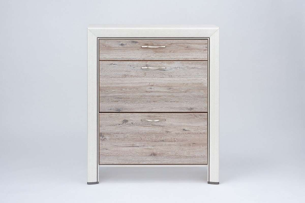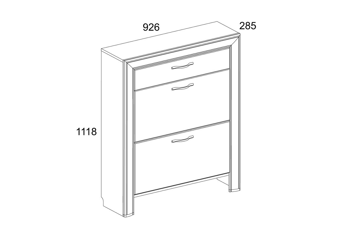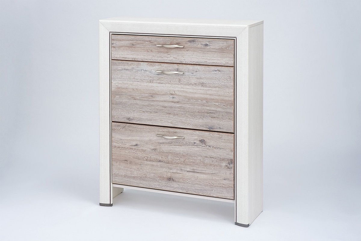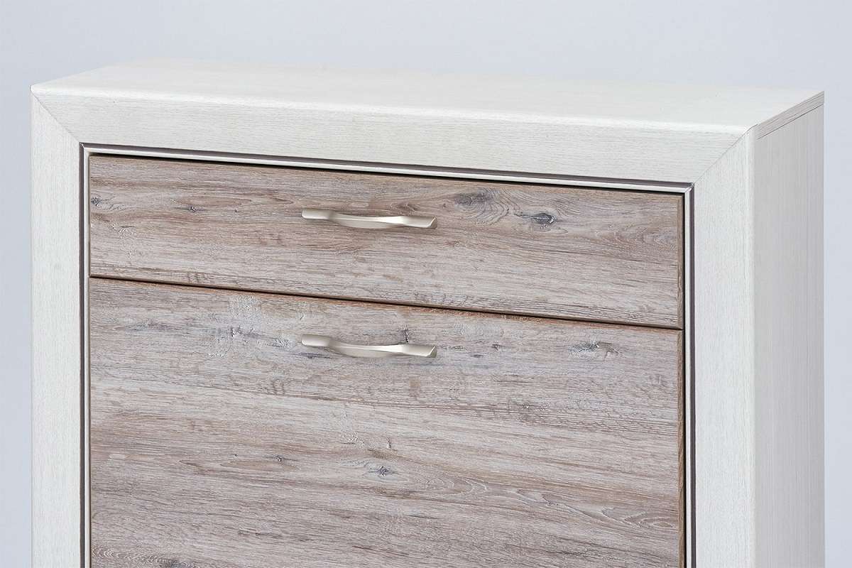 Тумба для обуви Оливия сочетает в себе функциональность и элегантный стиль. Благодаря небольшой глубине модель подходит для узкого коридора. Вместительность обувницы обеспечивается за счет ее высоты – в двух отделениях можно расположить до 12 пар туфель и ботинок. Конструктивная особенность секций в том, что они имеют откидную дверцу, которая может открываться на 45 или 90 градусов. Шариковые направляющие от польского производителя GTV обеспечивают плавное скольжение и бесшумное закрывание верхнего ящика. Выразительным обрамлением фасадов служат декоративные планки из МДФ с патинированной поверхностью. -