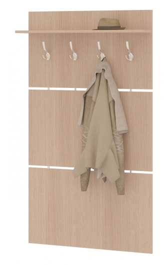Широкая навесная вешалка ВШ-3, выполненная в строгом стиле, позволит разместить сезонную одежду всей семьи. Вешалка состоит из 3-х панелей соединенных металлическими вставками. На верхней панели располагается четыре 3-хрожковых крючка для одежды.