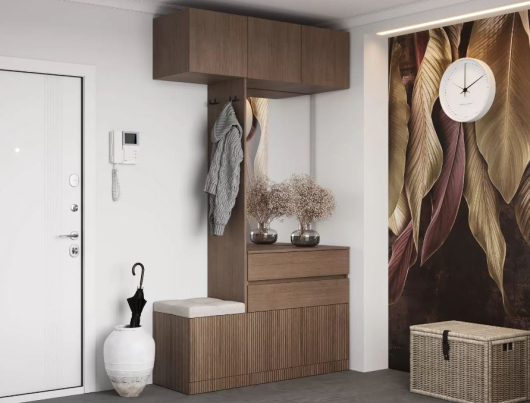- Фасады с механизмом открывания при нажатии: Верхние и нижние фасады прихожей открываются легким нажатием, что делает использование комфортным и без лишних усилий.