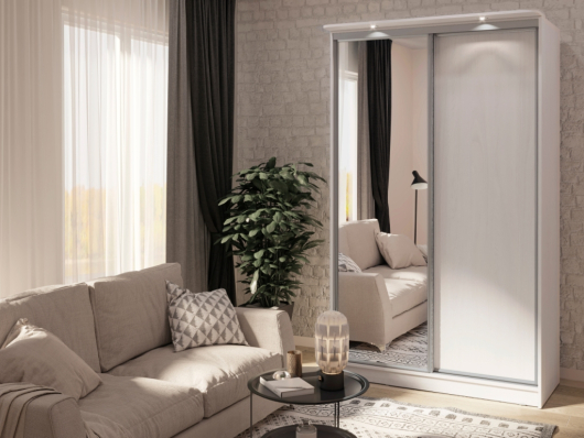 Шкаф-купе Домашний 1350 - функциональная и вместительная модель, которая безупречно впишется в любой интерьер комнаты. Продуманное внутреннее наполнение шкафа состоит из стеллажа для белья и стационарной штанги длиной 843 мм. В изготовлении шкафа использована прочная стальная система треков «Найди». Еще один атрибут заботы - шлегель. Это комплект щёток с толстым ворсом, которые устанавливаются на профиль дверей шкафа-купе и приглушают удары дверей при закрывании, а также способствуют пыленепроницаемости. Зеркальный фасад с обратной стороны проклеен специальной защитной пленкой, которая предотвратит падение осколков в том случае, если зеркало разобьется.