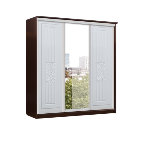 Шкаф купе отлично подойдет для модульной системы Атлантида и поможет разместить вещи. В шкафу есть платяное отделение со штангой для хранения вещей на вешалках, два бельевых шкафа с полками и четырьмя выдвижными ящиками. Большое зеркало покрыто защитной пленкой. Фасад украшен резьбой. -
