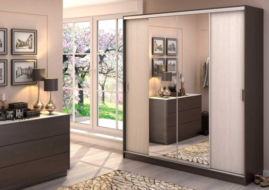 Вместительный современный шкаф-купе Альянс с зеркалом подойдет для любого интерьера. Он понравится тем, кто любит качественную, стильную мебель прекрасного дизайна. В шкафу имеются штанги и полки для вещей. -