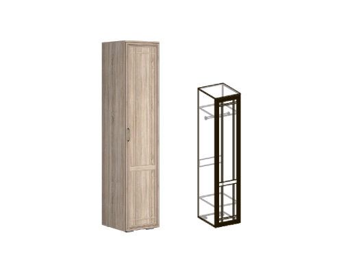 Пенал 440 Бруно прекрасно впишется в любой интерьер комнаты. За распашной дверью находится штанга для вешалок-плечиков с безупречно выглаженной одеждой, деловыми костюмами, красивыми платьями и верхней одеждой. Антресольная и нижняя полки пригодятся для различных аксессуаров и коробок с обувью.