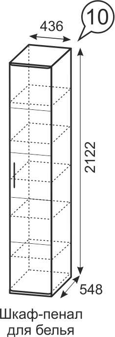 Шкаф-пенал 10 Монреаль станет гармоничным и функциональным дополнением общего интерьера уютной комнаты. Полки, скрытые за распашной дверью, пригодятся для размещения сложенной одежды, белья, обуви и аксессуаров.