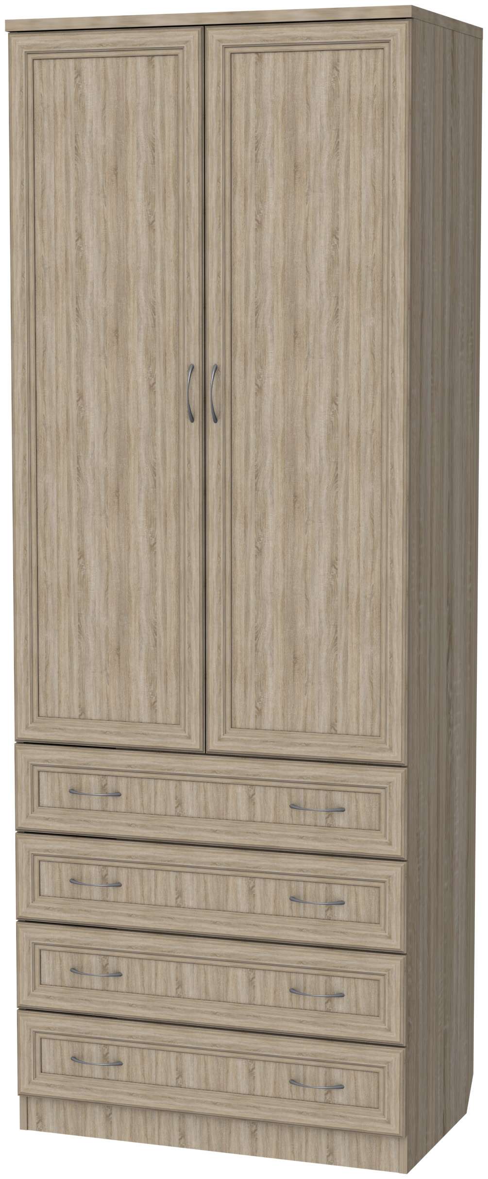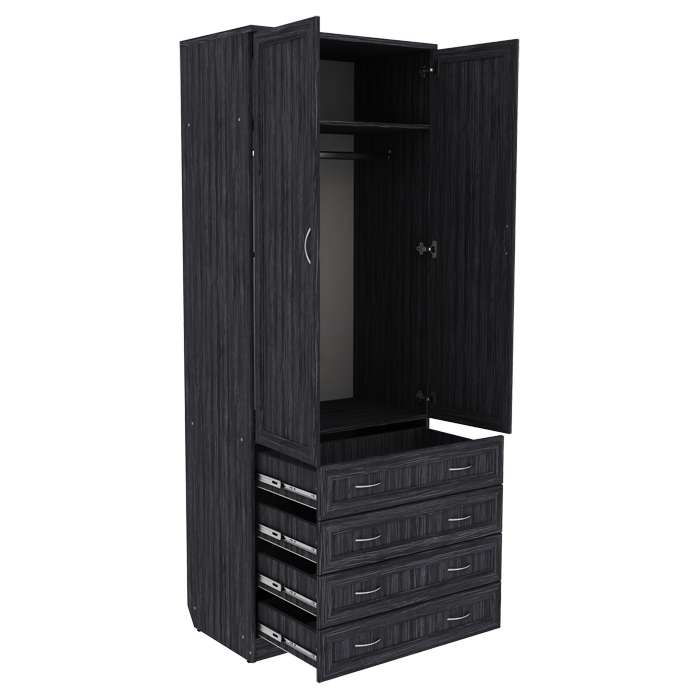 Шкаф 2-х дверный с ящиками Гарун 103 станет отличным дополнением интерьер любой комнаты. За распашными дверьми находится широкая штанга для вешалок-плечиков с верхней одеждой, костюмами, платьями, выглаженными брюками, строгими рубашками и элегантными блузами. Антресольная полка и четыре вместительных выдвижных ящика созданы для бережного хранения белья, украшений и всевозможных аксессуаров.
