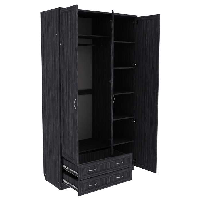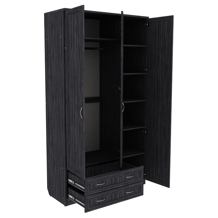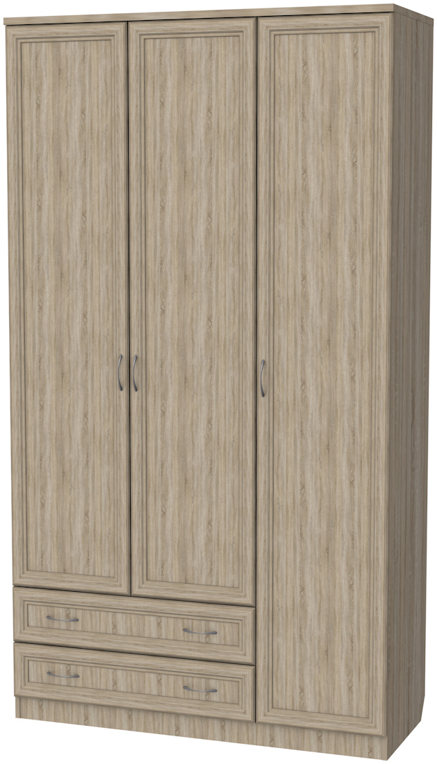 Шкаф 3-х дверный для одежды и белья с ящиками Гарун 114 станет отличным дополнением интерьер любой комнаты. За распашными дверьми слева находится широкая штанга для вешалок-плечиков с верхней одеждой, костюмами, платьями, выглаженными брюками, строгими рубашками и элегантными блузами. Множество полок, скрытых за правой распашной дверью, пригодятся для аккуратного хранения белья, разнообразных аксессуаров и косметики, а два выдвижных ящика можно использовать для постели и полотенец.