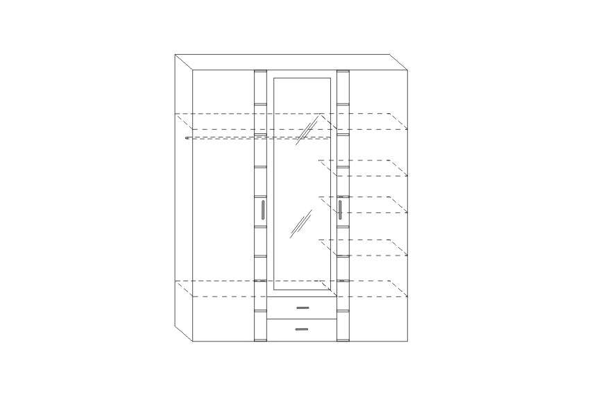 Шкаф для одежды Саша будет прекрасно смотреться не только в спальне, но также в детской или прихожей. Шкаф очень удобен и вместителен. Он разделен на два отделения: платяное и бельевое. Слева, за двумя распашными дверцами находится платяное отделение с антресольной полкой, горизонтальной штангой для хранения одежды на плечиках, внизу находится полка для хранения обуви. Справа расположено бельевое отделение с пятью полками. Внизу находятся два выдвижных ящика. Фасад шкафа украшен большим зеркалом.