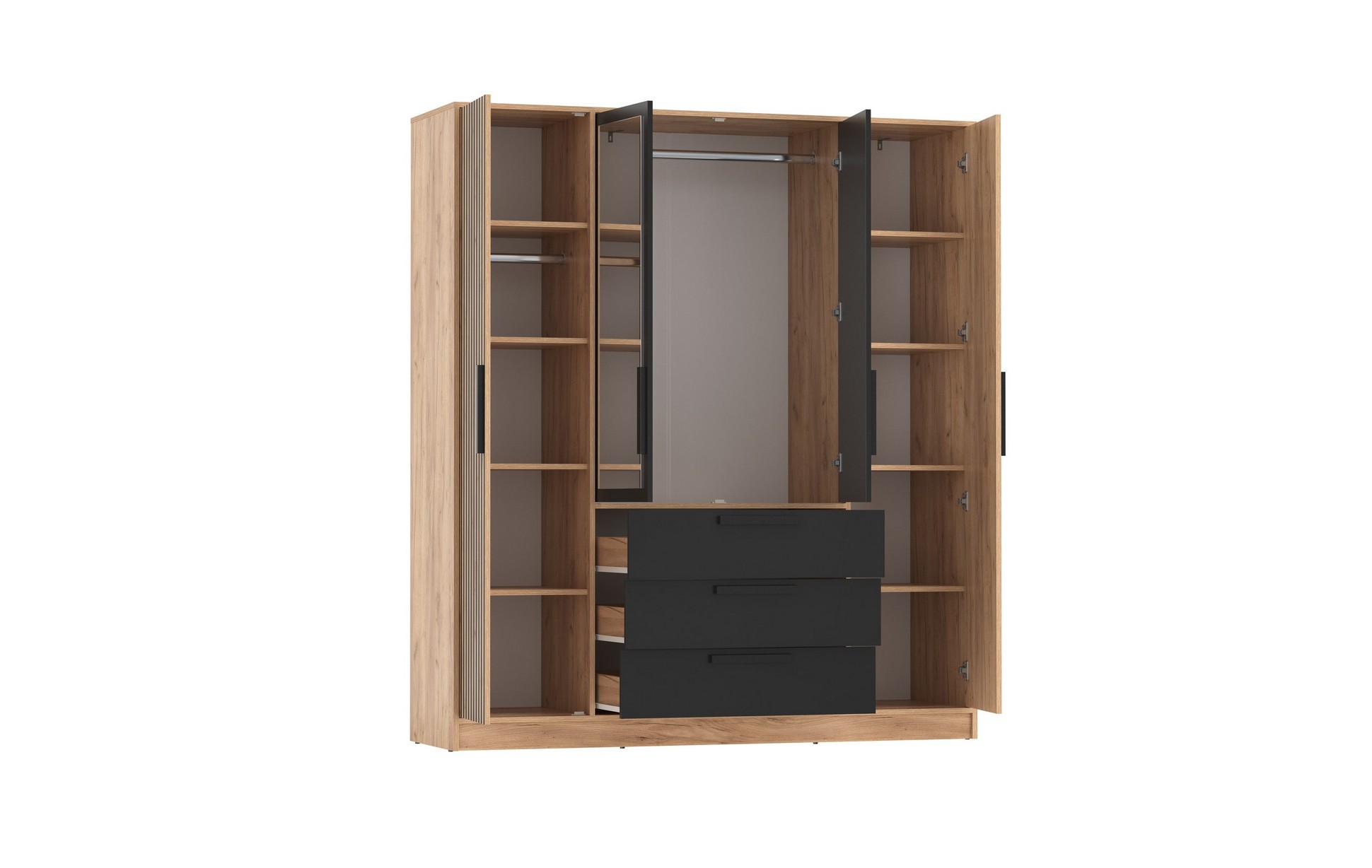 Шкаф 83.07 Вегас выглядит стильно, современно и элегантно. Четырёхдверный формат обеспечивает достаточно места для хранения, а сочетание древесного и черного цветов создает интересный визуальный эффект. Зеркала зрительно увеличивают пространство и делают шкаф более функциональным. -