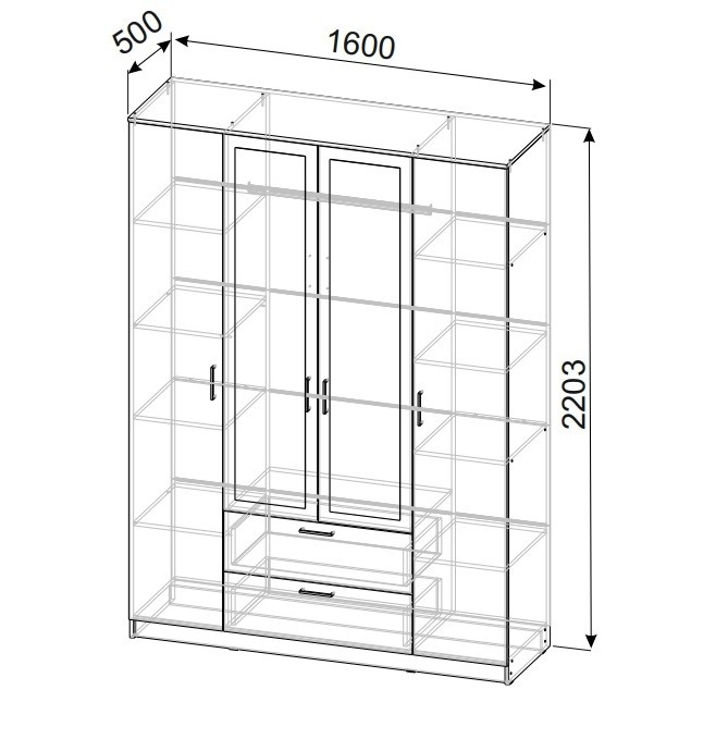 Ширина, мм 1600 Глубина, мм 500 Высота, мм 2200 ?МатериалМатериал изготовленияЛДСП Производитель Вариантов исполнения 1 -