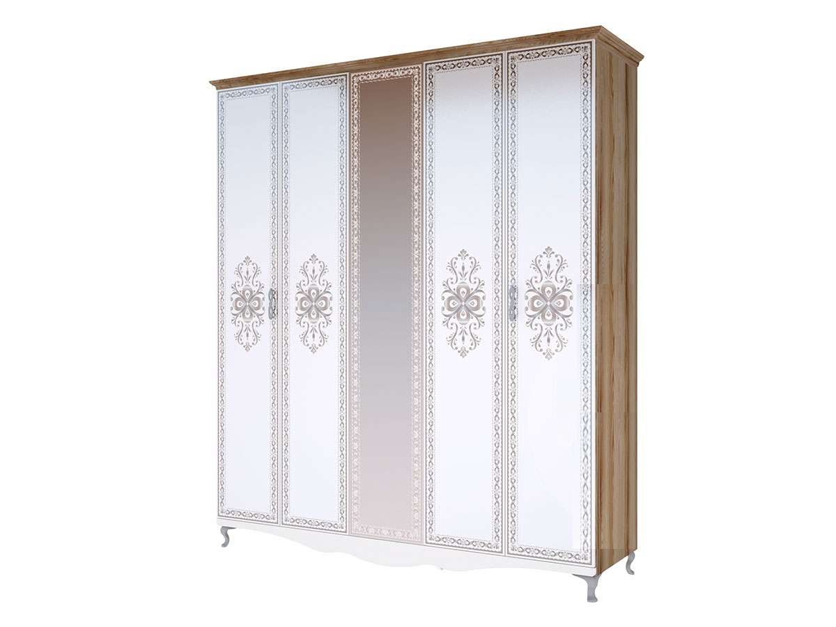 Шкаф-гармошка для одежды 5-ти дверный с 1 зеркалом Династия одна из составляющих модульной системы для спальни Династия. Внутри шкафа полки и штанга. Шкаф пятидверный. Полки в шкафу деревянные.