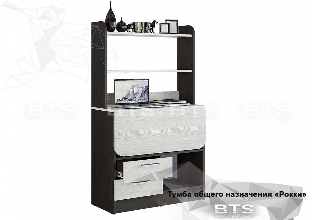 Тумба общего назначения Рокки является функциональным изделие, которое дополнит интерьер любой комнаты. Такую тумбу вы можете использовать в качестве дополнительного элементы для хранения вещей. Благодаря механизму «книжка», простая тумба превращается в полноценный письменный стол.