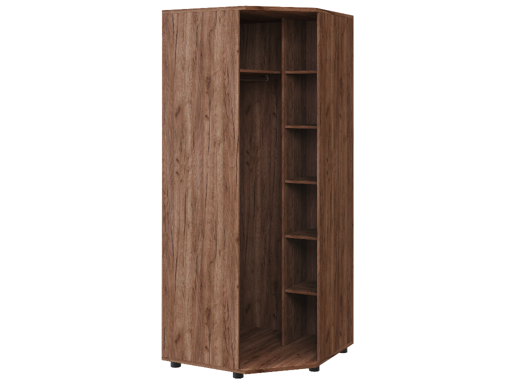 Шкаф угловой для одежды - это полноценный гардеробный шкаф с разделением на функциональные зоны. Шкаф оснащен полками для одежды, белья и коробок для обуви, а также штангой для вешалок и высокой антресольной полкой. Шкаф выполнен в современном стиле и может дополнить любую композицию мебели Ника Люкс.
