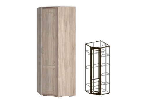 Шкаф угловой 440 Бруно создан для аккуратного и бережного хранения гардероба. За распашной дверью шкафа находятся небольшая штанга для вешалок-плечиков с безупречно выглаженной одеждой. Для размещения другой одежды, постельного и нижнего белья, различных аксессуаров и коробок с обувью предназначены полки.