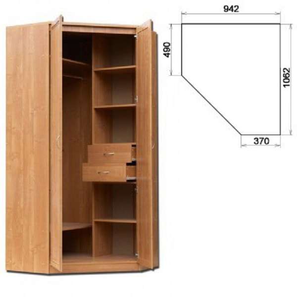 Шкаф угловой Гарун 403 станет отличным дополнением для обустройства уютной комнаты. За распашными дверьми находится вместительное и достаточно продуманное наполнение, которое позволит разместить ваш гардероб. Широкая штанга создана для вешалок-плечиков с верхней одеждой, красивыми платьями, деловыми костюмами, выглаженными рубашками, элегантными блузами и строгими брюками. Множество полок пригодятся для белья, коробок с обувью и разнообразных аксессуаров. Два небольших выдвижных ящика можно использовать для украшений и косметики.
