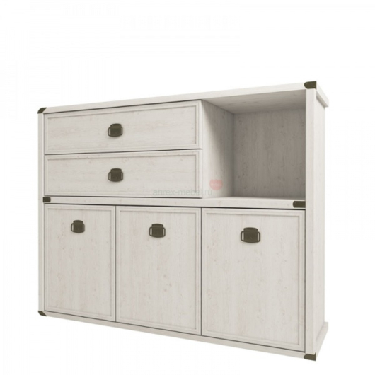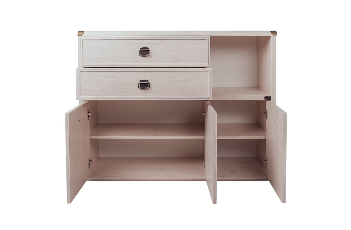 Тумба Магеллан впечатляет своей основательностью и тем, сколько вещей способна вместить, разгрузив пространство гостиной. В выдвижных ящиках с телескопическими направляющими можно разложить и с легкостью достать в нужный момент столовое белье. Две нижние секции с глухими дверцами обеспечат место для посуды, сервировочных аксессуаров, чайных и ароматических свечей, праздничного декора. Модель выдержана в морском стиле, нашедшем выражение в отделке: накладных металлизированных уголках и ручках-кольцах, как на корабельных рундуках. -