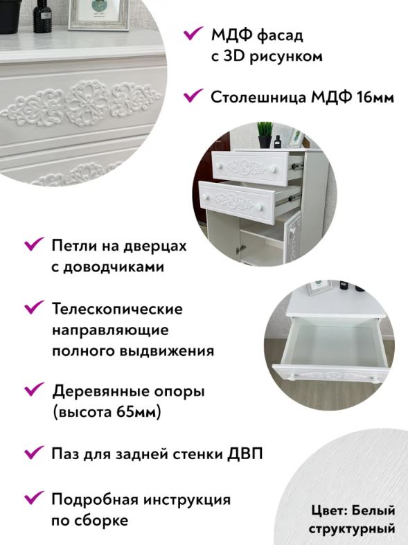 Фурнитура: петли с доводчиками, телескопические направляющие полного выдвижения. Высота опоры 65 мм.