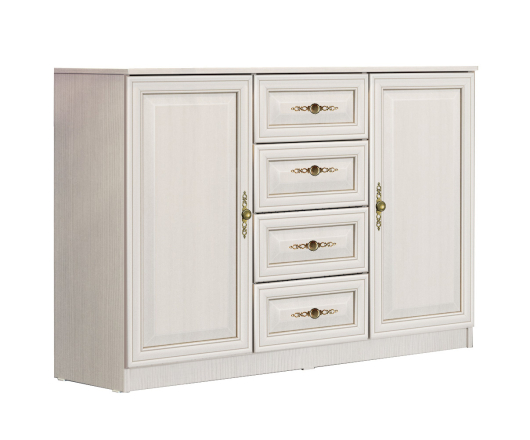 Комод Габриэлла 06.65 имеет компактные габариты, но обладает необычайной вместительностью. Таким изделием вы сможете заменить громоздкий и ненужный шкаф. Модель за распашными дверьми скрывает полки, которые созданы для аккуратного размещения одежды, постельного и нижнего белья. По центру находятся четыре выдвижных ящика для хранения разнообразных аксессуаров и косметики. Сверху на комоде вы сможете расположить вазу с красивыми цветами и семейные фотографии. Изысканная мебель Габриэлла способна украсить спальню и создать комфортные условия для отдыха.