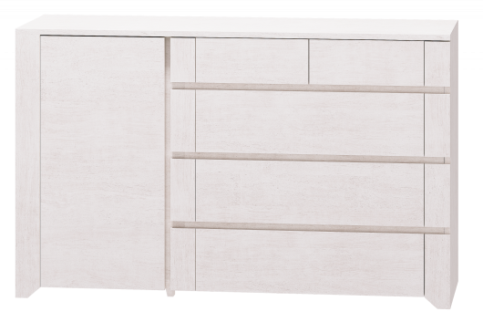 Комод комбинированный 11 Твист обладает удачным сочетанием компактности и необычайной вместительности. Пять выдвижных ящика и полки, скрытые за дверцей, пригодятся для размещения и бережного хранения одежды и белья, постели, полотенец, разнообразных аксессуаров или косметики. Столь небольшое изделие в условиях ограниченной площади способно заменить громоздкий шкаф.