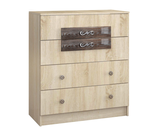Комод Мадлен безупречно впишется в интерьер уютной комнаты. Четыре достаточно вместительных выдвижных ящиков пригодятся для хранения одежды, постельного и нижнего белья, полотенец, разнообразных аксессуаров, украшений и косметики. Сверху на комоде вы сможете разместить семейные фотографии, вазу или вазон с цветами, сувениры, статуэтки и другие оригинальные предметы декора. Элегантный спальный гарнитур Мадлен с накладками из плиты МДФ, облицованными высокоглянцевой пленкой ПВХ и изысканной фурнитурой покорит даже самых взыскательных покупателей.