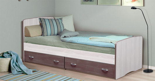 Кровать выполнена в классической прямоугольной форме. Дизайн классический. С двумя выкатными ящиками.