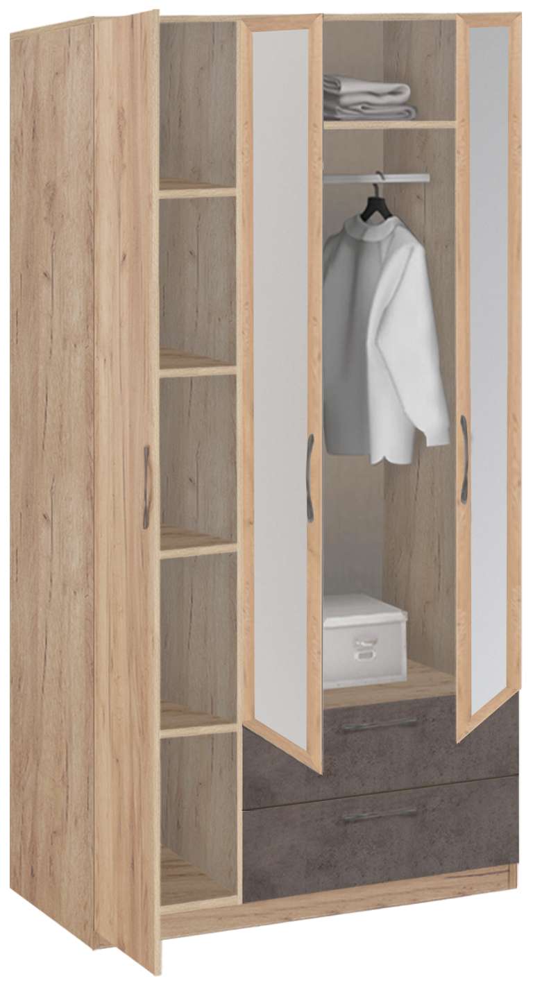 Шкаф для одежды 3-х дверный Лофт 19.31 безупречно впишется в интерьер уютной комнаты. Изделие предоставит достаточно места для бережного размещения вашего гардероба. За двумя распашными дверьми находится широкая штанга для вешалок-плечиков с выглаженной одеждой. Полки, скрытые за правой дверью, и два выдвижных ящика пригодятся для хранения сложенной одежды, нижнего и постельного белья, различных аксессуаров и коробок с обувью.