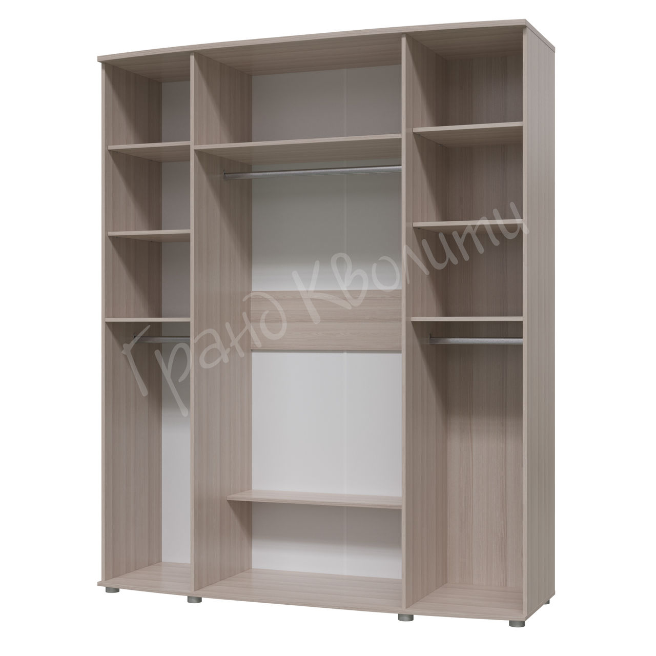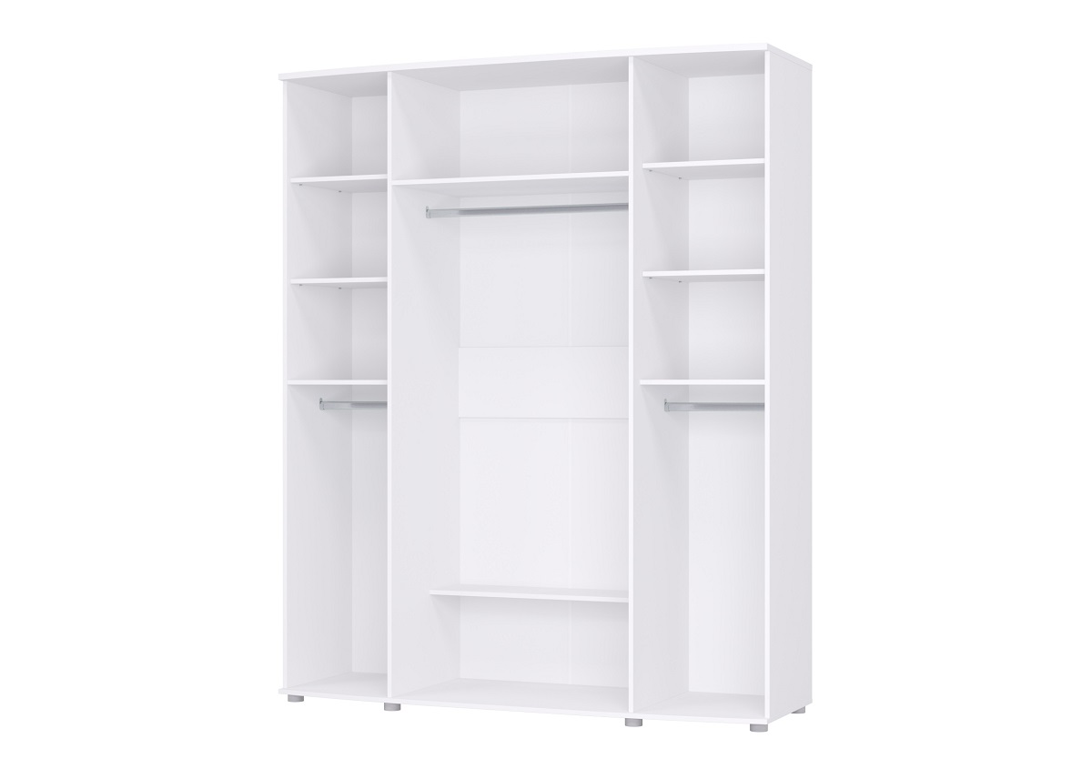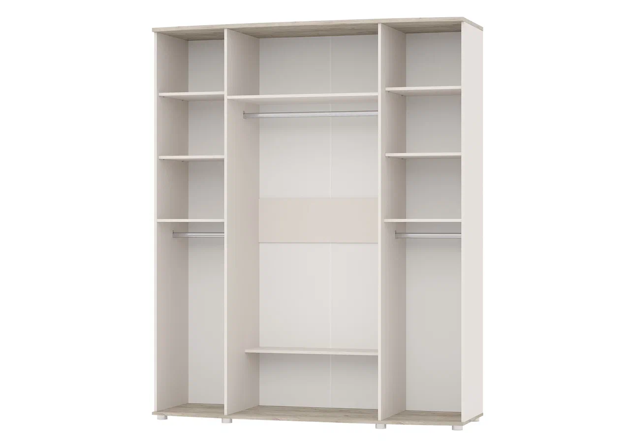 Внутри шкаф разделен на 3 секции. Левая и правая секции симметричны: горизонтальная штанга и сверху три полки. В центре шкафа – ниша с горизонтальной штангой. Сверху находится антресоль. Внизу – полка.