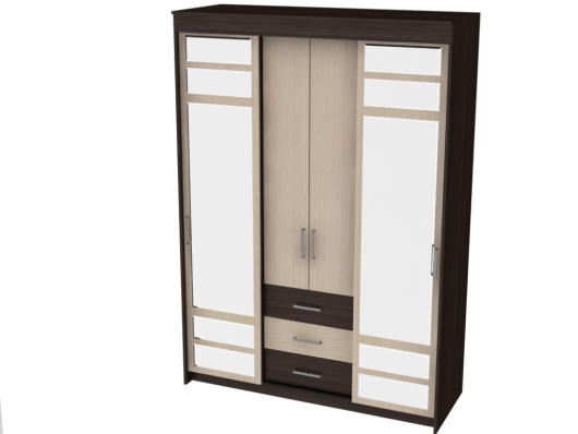Шкаф-купе комби Юнона прекрасно впишется в интерьер любой комнаты, а также предоставит достаточно места для размещения всего гардероба. Внутри находятся две штанги для вешалок-плечиков с костюмами, красивыми платьями, элегантными рубашками и верхней одеждой. Большое количество буду аккуратно и бережно хранить одежду, постельное и нижнее белье, коробки с обувью и всевозможные аксессуары. Три небольших, но достаточно вместительных выдвижных ящика можно использовать для салфеток, носовых платочков, бижутерии и других мелких предметов. Зеркала во всю высоту зрительно увеличат пространство и помогут подобрать идеальный образ.