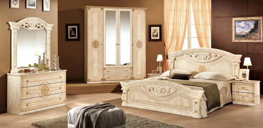 Спальня Рома (вариант 1) выполнена в роскошном классическом стиле. Благодаря декоративным элементам на мебели, создается ощущение античности. Такой набор идеально впишется в любой интерьер, и поразит своим дизайном настоящих ценителей классики.