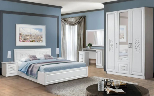 Спальня Аэлита выполнена в светлых, гармоничных тонах. Декор фасадов и серебристая фурнитура, служат настоящим украшением коллекции. Фасады Аэлита выполнены из МДФ.