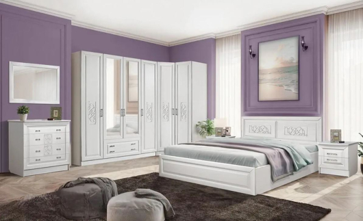 Спальня Аэлита выполнена в светлых, гармоничных тонах. Декор фасадов и серебристая фурнитура, служат настоящим украшением коллекции. Фасады Аэлита выполнены из МДФ.