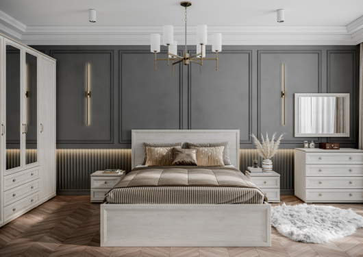 Спальня Александрия поможет обустроить достаточно функциональную и уютную комнату для полноценного отдыха. Прикроватные тумбы позволят держать около кровати все необходимые и важные предметы. На поверхности изделия вы можете красиво разместить интересный светильник, будильник или фотографию любимой семьи. Выдвижные ящики пригодятся для хранения увлекательной книги, маски для сна и ночного крема. На такой комфортной кровати вы сможете хорошо выспаться и отдохнуть. Кровать порадует вас своей функциональностью и внешним видом. Высокое изголовье позволит удобно расположиться перед сном и почитать увлекательную книгу или посмотреть новый фильм на планшете. За распашными дверьми шкафов находится достаточно места для сложенной одежды, постельного белья, а также различных аксессуаров и коробок с обувью.