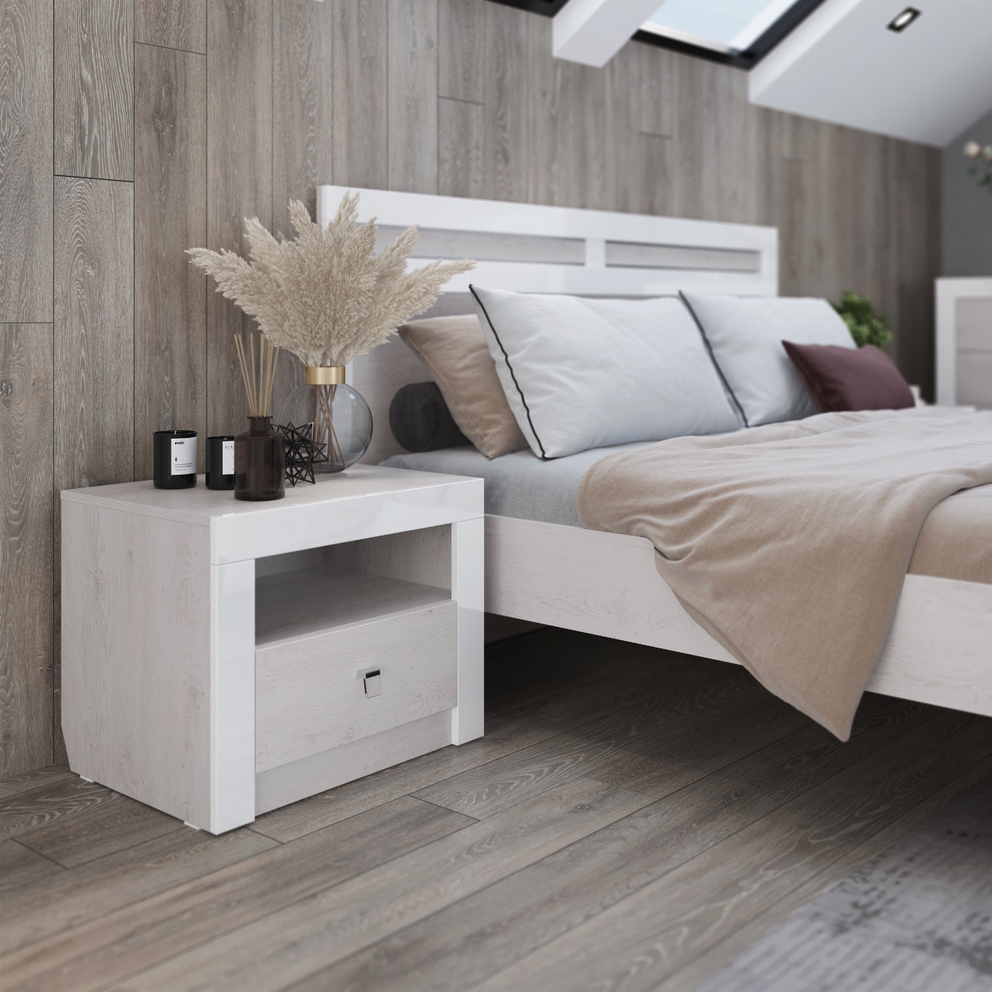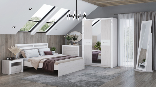 Спальня Амели поможет обустроить уютную комнату, в которой вы сможете расслабиться и ощутить домашнее тепло. Сверху на комоде будут прекрасно смотреться несколько фотографий, памятные сувениры и оригинальные предметы декора. Зеркало пригодится во время нанесения макияжа, укладки волос, а также для подбора удачных аксессуаров и украшений. Кровать предоставит необычайно удобное спальное место, где вы после трудных и насыщенных дней сможете расслабиться, отдохнуть и набраться сил. Высокое изголовье позволит комфортно расположиться перед сном и почитать интересную книгу или посмотреть сериал на планшете. Прикроватные тумбы позволят держать все важные и необходимые предметы около кровати. Вместительный выдвижной ящик и открытая ниша пригодятся для хранения книги для чтения перед сном, маски для беззаботного сна и крема для увлажнения рук. В правой части 3-х дверного шкафа находится широкая штанга для вешалок-плечиков. Полки, скрытые в левой части, пригодятся для размещения сложенной одежды, постельного и нижнего белья, различных аксессуаров и коробок с обувью.