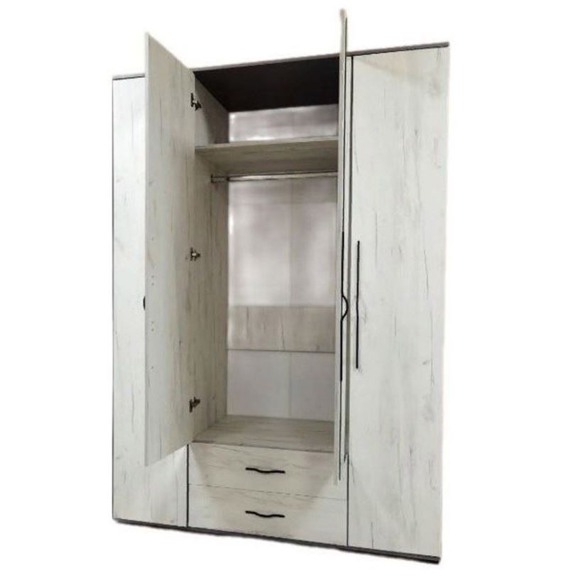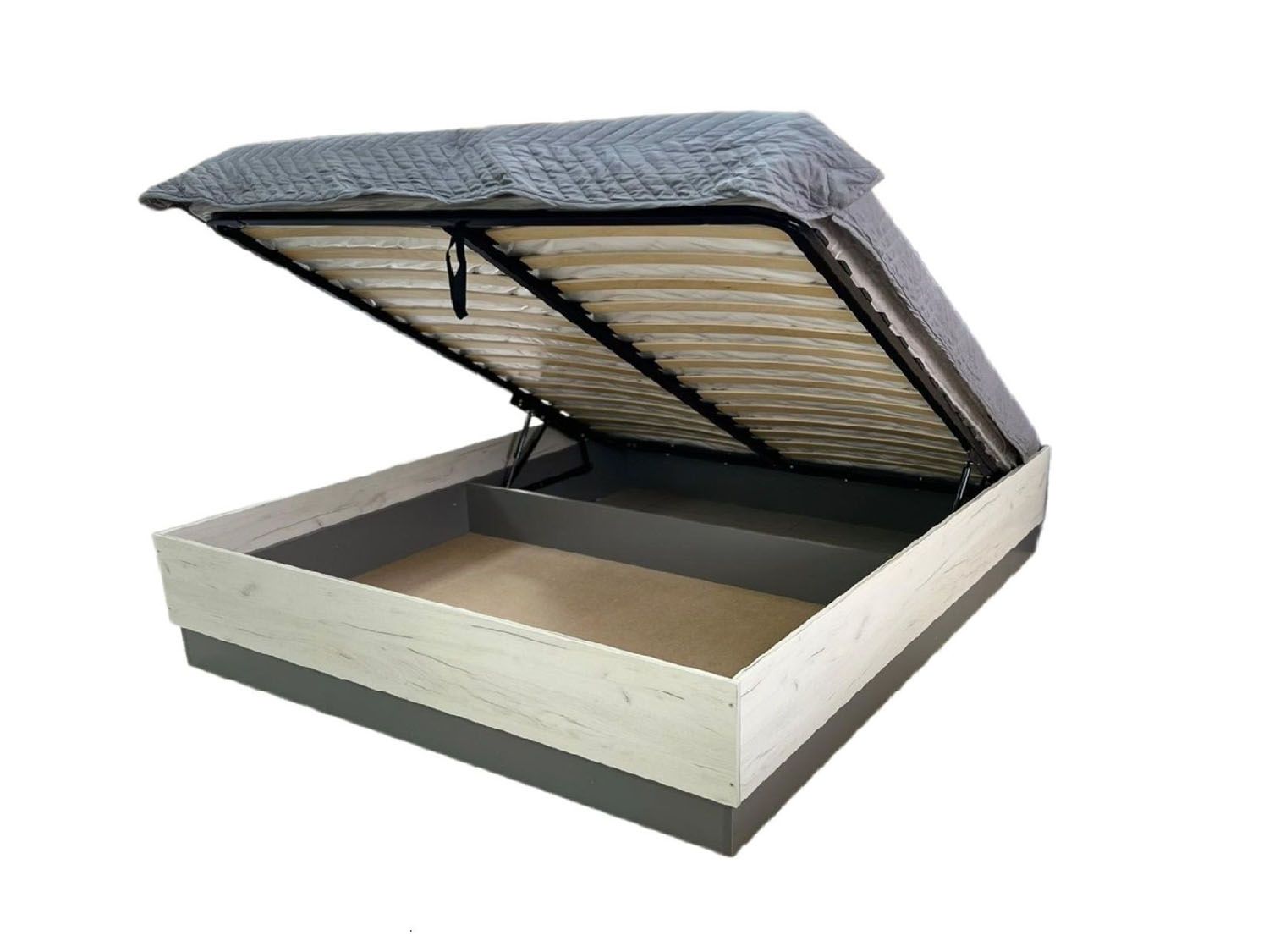 Спальня Бастион 1 прекрасное решение для современного интерьера. В коллекции Бастион сочетается декор «Дуб Крафт белый» с контрастными линиями декора «Серый шифер». Опоры пластиковые, ручки металл. Кровать с подъёмным механизмом, ортопедическим основанием и вместительным ящиком для белья.