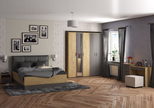 Спальня Бруно 2 дополнит ваш интерьер и расположит вещи с комфортом. Сочетание древесных тонов с серым в мебели Бруно — одно из самых популярных и универсальных. Серый цвет обладает нейтральностью и успокаивает, а дерево добавляет теплоту и текстуру. Зеркало добавит интерьеру пространства.