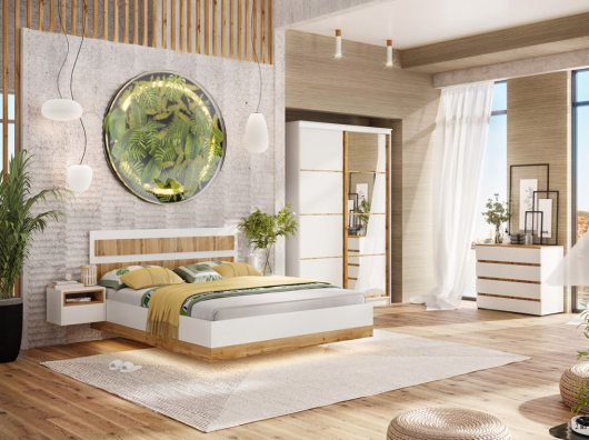 Спальня Дубай в сочетании древесного цвета с белым создаёт стильный и уютный интерьер. Это сочетание пользуется популярностью благодаря своей универсальности и способности гармонично вписываться в различные стили оформления.