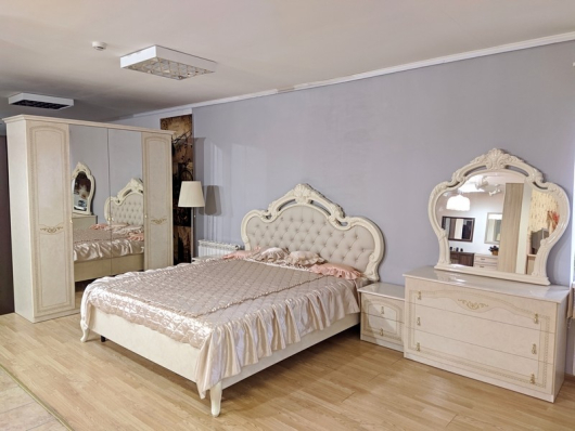 В состав спальни Ирина 3 входят следующие элементы: тумба прикроватная - 2 шт., кровать со спальным местом - 1800 х 2000 мм, комод с тремя выдвижными ящиками, зеркало и 4-х дверный шкаф для одежды и белья.