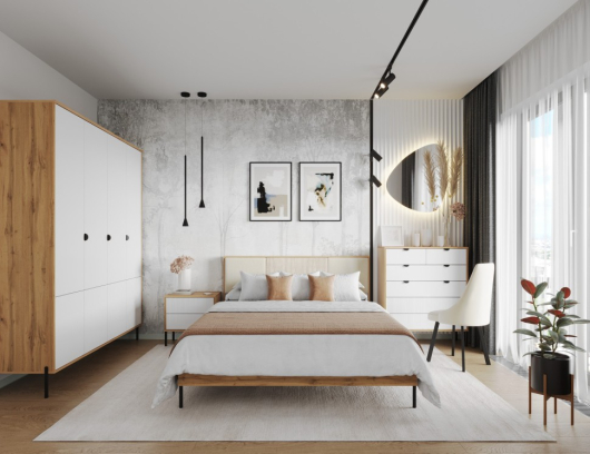 Спальня Кензо стильное и модное решение для обустройства спальни. Сочетание тёплых, древесных тонов с белоснежными фасадами придаёт спальне Кензо определённый шарм. -