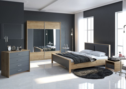 Спальня Либерти в сочетании серого и древесного цветов с зеркальным шкафом – это современное, стильное и практичное решение. Такое сочетание цветов создает спокойную и расслабляющую атмосферу, а зеркальный шкаф создает простор и свет. -