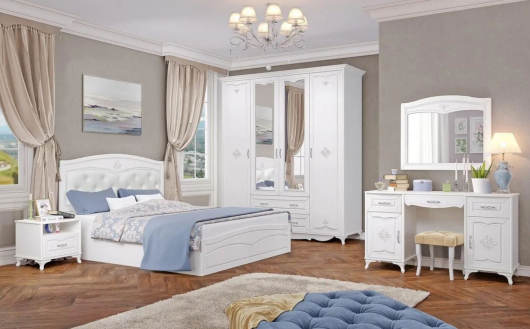 Спальня Лидия выполнена в светлых, гармоничных тонах. Декор фасадов и серебристая фурнитура, служат настоящим украшением коллекции. Фасады Лидия выполнены из МДФ.
